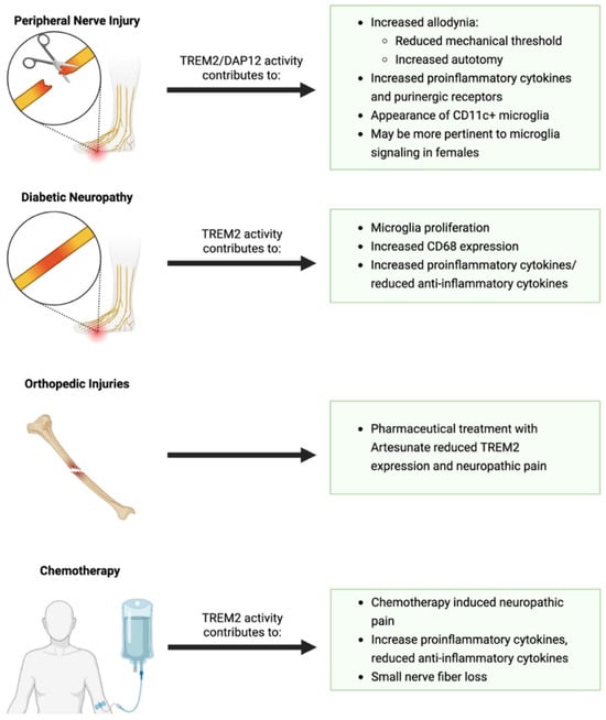 Physiological pain is crucial for detecting and responding to noxious stimuli. As discussed above, the flexion withdrawal reflex depends on cutaneous nociceptors to detect a painful stimulus and rapidly withdraw that part of the body from a potentially damaging stimulus. However, if pain persists post-healing or during disease, it becomes pathological. Identifying mechanisms to remedy pain sensation without compromising healing is essential for therapeutic advancement. In this section, we will discuss TREM2’s involvement in microglia function in various neuropathic pain conditions.