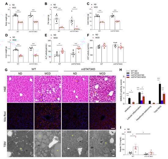 Effect of myeloid-specific STAT3 deletion on hepatic lipid accumulation in MCD diet-fed mice. WT and mSTAT3KO mice were fed an ND or MCD diet for 4 weeks to induce MASH. (A) Body weight (n = 7–11 mice per group). (B) Fat mass (n = 6–10 mice per group). (C) Lean mass (n = 6–10 mice per group). (D) Liver weight (n = 7–9 mice per group). (E,F) Hepatic ALT and AST activity (n = 8 mice per group). (G) Representative images of hematoxylin and eosin (H&E) staining, Nile red staining of liver sections (scale bar, 50 μm), and transmission electron micrographs of hepatocytes (scale bar, 2 μm). Yellow arrows and asterisks indicate neutrophils and lipid droplets (LDs), respectively. (H) MASLD activity score. (I) Hepatic triglyceride (TG) levels (n = 5–6 mice per group). Statistical significance was determined by using two-way ANOVA with Bonferroni’s post hoc testing. * p < 0.05, ** p < 0.001, and *** p < 0.0001.