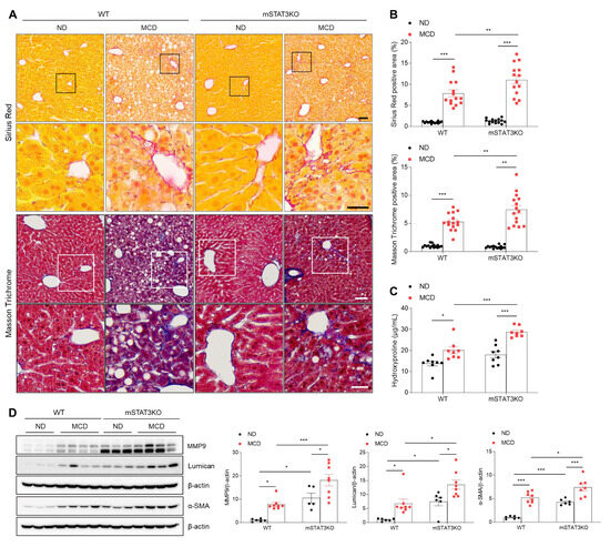 In addition to intrahepatic lipid accumulation, the MCD diet itself induces advanced perisinusoidal and periportal fibrosis [19]. To understand the potential mechanisms by which mSTAT3KO induces hepatic fibrotic changes in MCD diet-fed mice, we performed histological staining and quantified fibrogenic proteins. Sirius Red and Masson Trichrome staining revealed that MCD diet-induced perisinusoidal fibrosis in WT mice is enhanced by mSTAT3KO (Figure 2A,B). In addition, we found that mSTAT3KO increases MCD diet-induced hydroxyproline levels in liver tissues compared to MCD diet-fed WT mice (Figure 2C). Some fibrogenic proteins, such as matrix metalloproteinase 9 (MMP9), lumican, and α-smooth muscle actin (α-SMA), were significantly increased by the MCD diet or mSTAT3KO (Figure 2D). Unexpectedly, the MCD diet aggravated mSTAT3KO-induced MMP9, lumican, and α-SMA protein levels compared to MCD diet-fed WT mice. Our results indicate that although myeloid-specific STAT3 deletion attenuates intrahepatic lipid accumulation, it paradoxically promotes MCD diet-induced hepatic fibrosis.