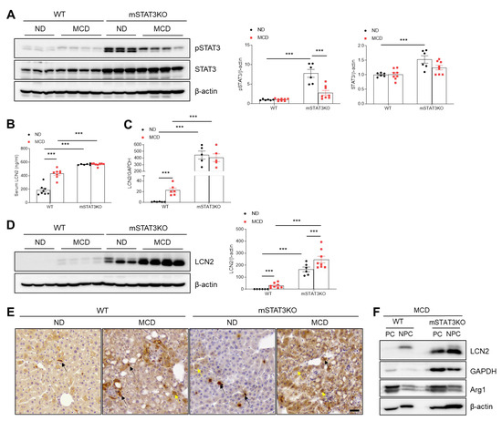 The effect of myeloid-specific STAT3 deletion on hepatic pSTAT3 and LCN2 protein expression in MCD diet-fed mice. (A) Western blot analysis and quantification of pSTAT3 and STAT3 proteins in liver lysates (n = 6–8 mice per group). β-actin was used as a loading control. (B) Serum LCN2 levels (n = 6–8). (C) LCN2 mRNA levels in liver tissue (n = 5–6 mice per group). (D) Western blot analysis and quantification of LCN2 proteins in liver lysates (n = 6–8 mice per group). β-actin was used as a loading control. (E) Immunohistochemistry for LCN2 in liver sections. Black and yellow arrows indicate Kupffer cells and hepatocytes, respectively. Scale bar: 30 μm. (F) Western blot analysis of LCN2 protein in PCs and NPCs isolated from the livers of MCD diet-fed WT and mSTAT3KO mice. GAPDH and β-actin were used as loading controls and Arg1 served as a hepatocyte marker. Statistical significance was determined by using two-way ANOVA with Bonferroni’s post hoc testing. Statistical significance between WT ND and WT MCD in (C,D) was assessed using an unpaired two-tailed Student’s t-test. *** p < 0.0001.
