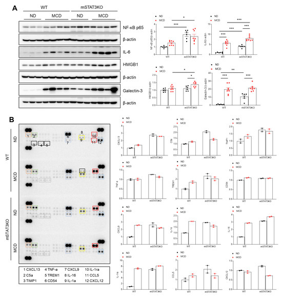 Given that STAT3/LCN2 signaling-related fibrosis was linked to hepatic inflammation, we determined NF-kBp65-related inflammatory cytokine and chemokines using Western blot analysis and a proteome profiler cytokine array. Not only the MCD diet, but also mSTAT3KO itself caused a significant inflammatory response—related NF-kBp65, interleukin-6 (IL-6), and high-mobility group box1 (HMGB1) proteins were increased, and they were enhanced in MCD diet-fed mSTAT3KO mice (Figure 4A). However, mSTAT3KO-induced galectin-3 was not promoted by the MCD diet. Using a liver cytokine array, we found that compared to ND diet-fed WT mice, C-X-C motif chemokine 13 (CXCLl3), C5a, tissue inhibitor matrix metalloproteinase1 (TIMP1), triggering receptor expressed on myeloid cells1 (TREM1), CD54, CXCL9, IL-1α, IL-16, IL-1ra, and chemokine ligand 5 (CCL5) were increased in MCD diet-fed WT or ND diet-fed mSTAT3KO mice (Figure 4B). However, the increased levels of C5a and CXCL12 in ND diet-fed mSTAT3KO mice were decreased by mSTAT3KO. These findings imply that mSTAT3KO could promote MCD diet-induced hepatic inflammation, resulting in upregulation of hepatic fibrosis.