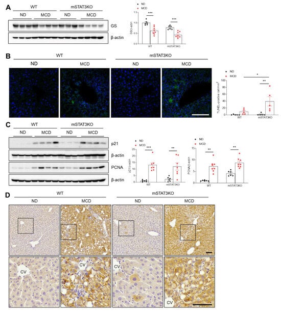 To assess whether mSTAT3KO promotes liver apoptosis and regeneration in MCD diet-fed mice, we evaluated the effects of the MCD diet on hepatic glutamine synthetase (GS), a susceptible protein to oxidative damage. Compared with MCD diet-fed WT mice, hepatic GS protein was reduced in MCD diet-fed STAT3KO mice (Figure 5A). TUNEL staining also showed a dramatic increase in TUNEL-positive cells in MCD diet-fed mSTAT3KO mice compared with MCD diet-fed WT mice (Figure 5B). To determine whether the MCD diet affects liver regeneration in response to hepatocyte apoptosis, we assessed p21, proliferating cell nuclear antigen (PCNA), and Ki67 protein levels (Figure 5C,D). As expected, these proteins were significantly increased by only the MCD diet. Although mSTAT3KO caused a slight increase in p21 and PCNA protein levels, they were not promoted by mSTAT3KO (Figure 5C). Immunohistochemistry revealed that many Ki67-positive hepatocytes were observed in both MCD diet-fed WT and mSTAT3KO mice (Figure 5D). These data suggest that myeloid STAT3 may play a protective role in hepatocyte apoptosis in MCD diet-induced MASH.