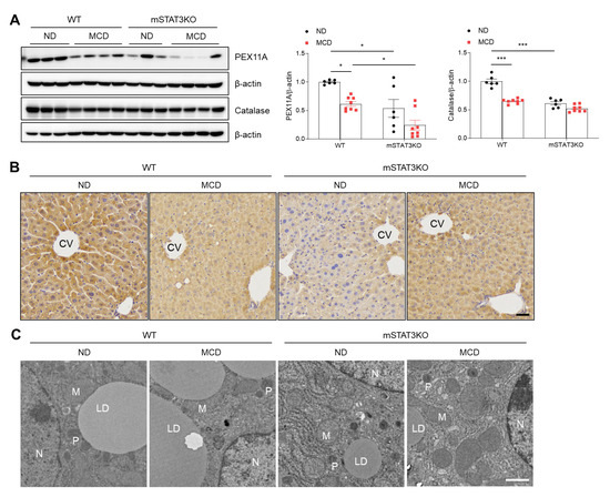 LCN2 is an essential mediator linking hepatocyte apoptosis and peroxisome activity with intracellular fatty acid (FA) levels [20]. In particular, peroxisomal function is involved in oxidative reactions, including the oxidation of very-long-chain fatty acids. To assess peroxisomal activity, we determined peroxisomal membrane protein 11A (PEX11A) and catalase (classical marker protein of peroxisome) protein levels. These protein levels were reduced in MCD diet-fed and mSTAT3 mice compared with ND diet-fed WT mice (Figure 6A). Immunohistochemistry also revealed that compared to ND diet-fed WT mice, less immuno-stained PEX11A-positive hepatocytes were observed in MCD diet-fed and mSTAT3KO mice (Figure 6B). TEM revealed that in ND diet-fed WT mice, close contacts between large LD and peroxisome were observed, while these contacts disappeared in the hepatocytes of MCD diet-fed and mSTAT3KO mice (Figure 6C). So, our findings indicate that hepatocyte-derived LCN2 may be linked to reduced peroxisomal activity and mitochondrial FA oxidation induced by the MCD diet.