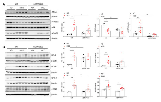 Although mSTAT3KO caused a significant reduction in hepatic TG contents in MCD diet-fed mice, MCD diet-fed mSTAT3KO mice showed aggravated hepatic inflammation, fibrosis, and apoptosis. To understand these contrasting phenotypes, we determined FA oxidation and oxidative stress-related protein expression using Western blot analysis. Under MCD diet-induced CD36 protein conditions, hepatic peroxisome proliferator-activated receptor α (PPARα), the principal transcriptional factor governing FA oxidation, was reduced by the MCD diet and mSTAT3KO (Figure 7A). However, increased hepatic CD36 protein in MCD diet-fed WT mice was significantly reduced by mSTAT3KO. Mitochondrial FA oxidation plays an essential role in the regulation of intrahepatic lipid accumulation during intracellular lipolysis for energy production. Following lipolysis, long-chain FAs are transported into the mitochondria [21]. Among the Acyl-CoA Thioesterase (ACOT) family, ACOT2 localizes to the mitochondrial matrix and hydrolyses long-chain fatty acyl-CoA [22]. In line with the altered expression of PEX11A and catalase protein (Figure 6A), we notably found that hepatic ACOT2 was prominently reduced by mSTAT3KO (Figure 7A). However, mSTAT3KO significantly reduced MCD diet-induced ACOT2 protein levels compared to those in MCD diet-fed WT mice.