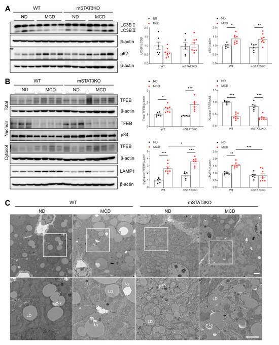 Given that microtubule-associated protein 1A/1B–light chain 3 (LC3) lipidation and its association with autophagosome membranes have been demonstrated to be valuable autophagy markers, we investigated autophagic flux using LC3B and p62 antibodies. As expected, a significant increase in p62 protein was shown in MCD diet-fed WT mice compared to ND diet-fed WT mice (Figure 8A). After autophagosomes form, they fuse with lysosomes for hydrolytic digestion [23]. So, we examined whether the MCD diet alters transcription factor EB (TFEB) protein levels, the master regulator of lysosomal gene expression. Compared to ND diet-fed WT mice, total and cytosolic TFEB protein levels were significantly increased in the livers of MCD diet-fed WT mice (Figure 8B). However, nuclear TFEB protein was prominently reduced in MCD diet-fed WT and mSTAT3KO mice. We next found that lysosomal-associated membrane protein (LAMP1), a marker of lysosome, was significantly increased in MCD diet-fed mice, while its protein was reduced in MCD diet-fed mSTAT3KO mice (Figure 8B). TEM revealed that large LDs and lipolysosomes (Ly) within hepatocytes were observed in MCD diet-fed WT mice compared to ND diet-fed WT mice (Figure 8C). These findings indicate that mSTAT3 could partly impair autophagic flux within hepatocytes in MCD diet-fed mice.