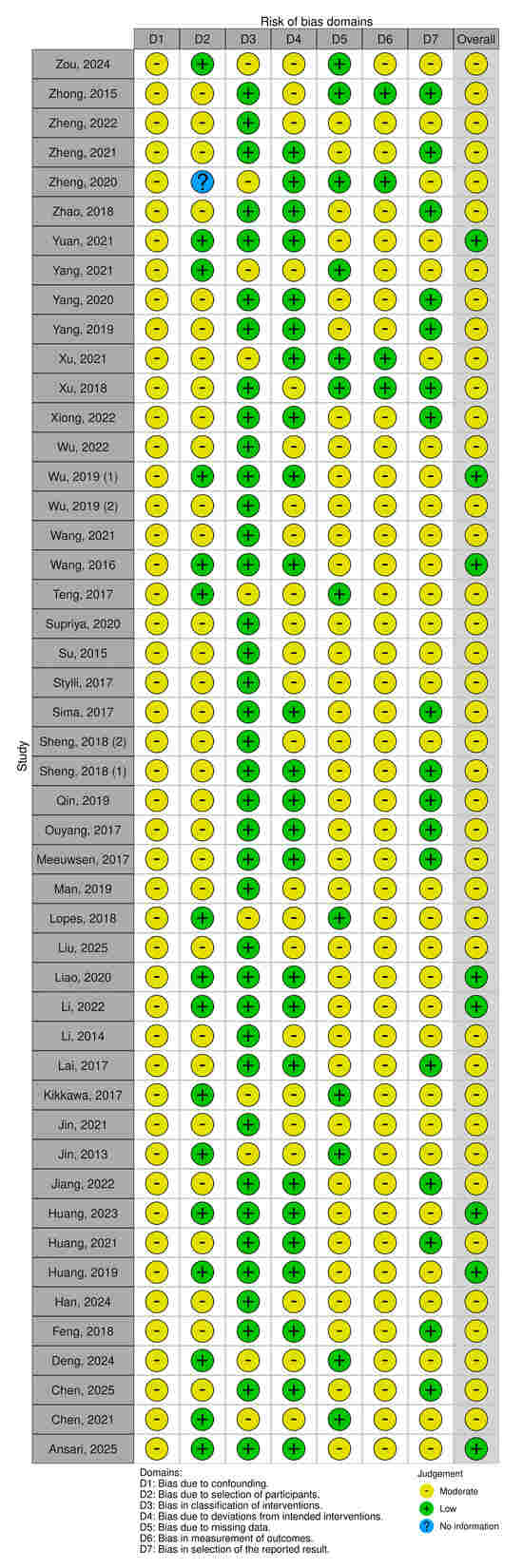 Overall, 48 studies were included in this systematic review. The study selection process adhered to the PRISMA 2020 guidelines (Figure 1). The ROBINS-I V2 tool was used to assess the risk of bias for each included study (Figure 2).