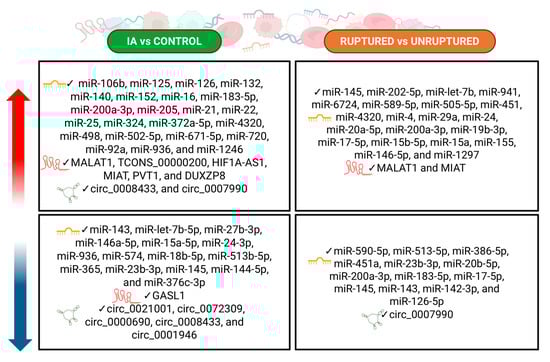 With respect to rupture status, several miRNAs, including miR-145, miR-202-5p, miR-let-7b, miR-941, miR-6724, miR-589-5p, miR-505-5p, miR-451, miR-4320, miR-4, miR-29a, miR-24, miR-20a-5p, miR-200a-3p, miR-19b-3p, miR-17-5p, miR-15b-5p, miR-15a, miR-155, miR-146-5p, and miR-1297, were reported at higher levels in ruptured compared to unruptured IAs [26,27,30,31,32,38,43,45,55,60,62].