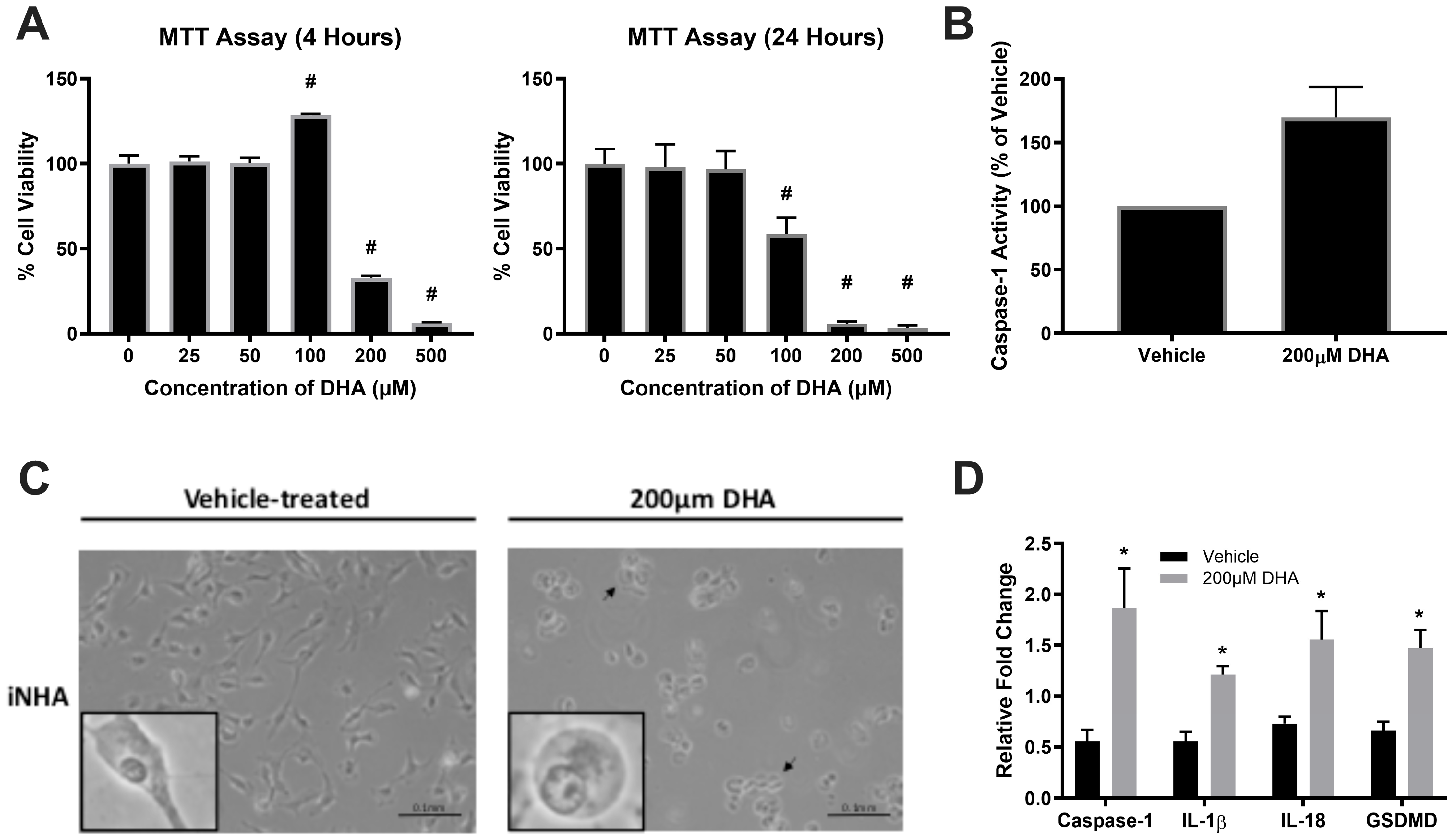 Figure 1. DHA treatment of iNHA cells induced morphological and molecular changes consistent with pyroptotic activation. (A) iNHA were incubated with increasing concentrations of DHA for 4 h (left graph) and 24 h (right graph), respectively, and evaluated for cell viability by MTT assay. (B) Increased caspase-1 activity was apparent at 4 h after DHA treatment. (C) iNHA cells were treated with vehicle or 200 μM DHA for 4 h and monitored for morphological changes by phase-contrast microscopy, with higher-magnification insets of individual cells to illustrate changes characteristic of pyroptotic cytoplasmic swelling (also indicated by black arrows in the representative micrograph on the right, scale bar: 0.1 nm). (D) Gene expression of key pyroptotic mediators, including caspase-1, IL-1β, IL-18 and gasdermin D (GSDMD), was determined by qPCR at 2 h after vehicle (black bars) or DHA treatment (grey bars). # p < 0.05 compared to 0 time-point (one-way ANOVA followed by post hoc Dunn’s tests). * p < 0.05 compared to vehicle control (Student’s t-tests).