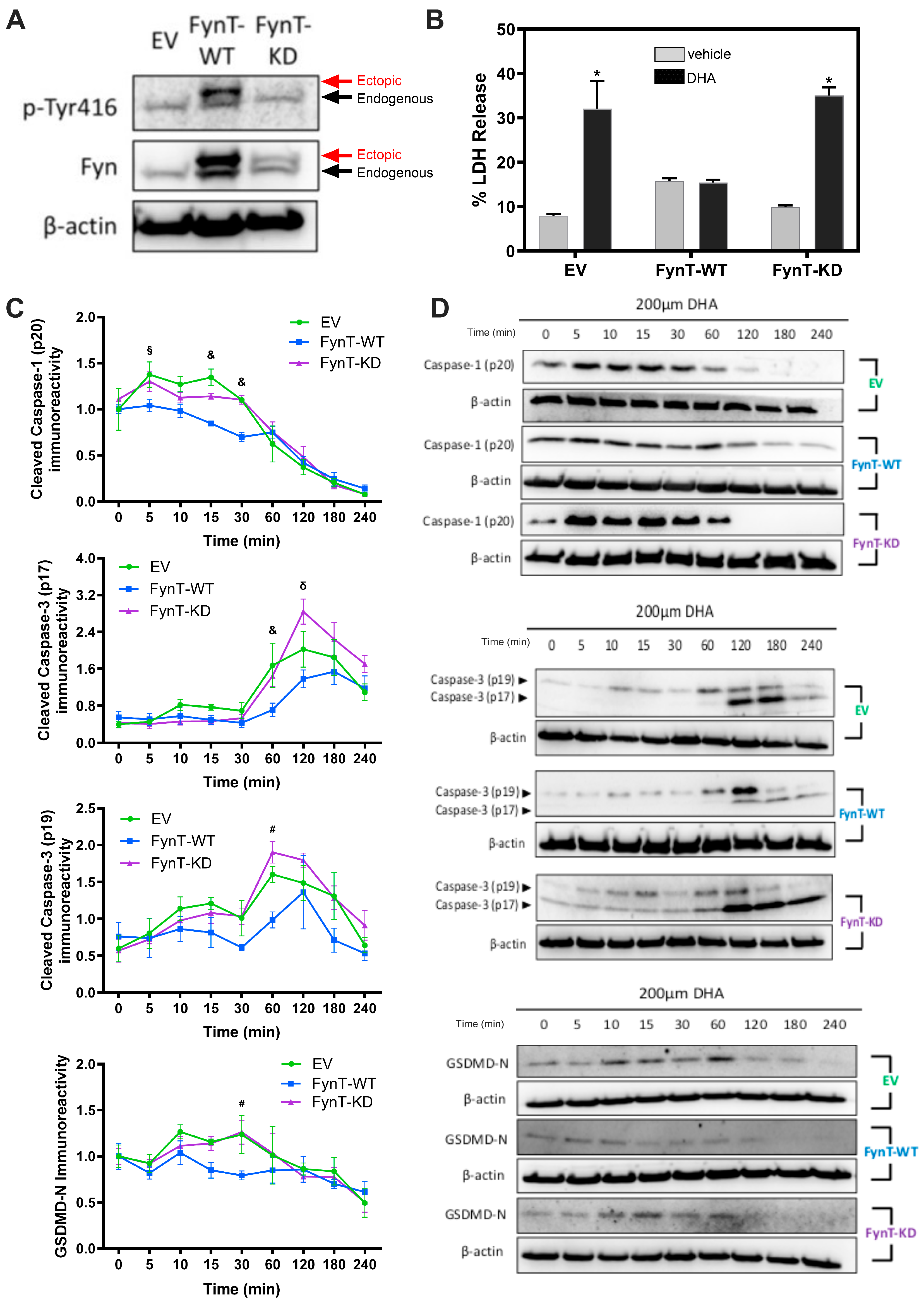 Figure 2. FynT activity negatively regulates pyroptotic markers in iNHA. (A) Representative immunoblots of iNHA clones stably expressing EV, FynT-WT or FynT-KD were assessed for Fyn immunoreactivity and Fyn kinase activity using antibodies against Fyn and pTyr416, respectively. Ectopic (transfected) expression of Fyn is denoted by the red arrow (upper band), and endogenous Fyn is denoted by the black arrow (lower band). The kinase-dead effect of transfected FynT in FynT-KD was confirmed by the presence of ectopic bands corresponding to Fyn in both FynT-WT and FynT-KD, but by the loss of an ectopic band corresponding to pTyr416 in FynT-KD. All the iNHA clones were treated with 200 μM DHA and compared for clone-specific changes in the immunoreactivities of pyroptotic markers for up to 4 h. (B) LDH release (% of the maximum LDH release from lysed cells) was measured at 4 h post-treatment. (C) Graphs depicting time-course and (D) representative immunoblots of cleaved caspase-3 (p19 and p17), cleaved caspase-1 (p20) and GSDMD-N across a 4 h time-course. Data presented were derived from 3 to 4 independent experiments. Values are expressed as mean ± S.E.M. * p < 0.05 when compared to vehicle control or 0 time-point using Student’s t-tests. For time-course experiments, significant differences were observed between clones using two-way ANOVA followed by post hoc Bonferroni’s tests, where: & p < 0.05 when comparing EV and FynT-KD to FynT-WT; δ p < 0.05 when comparing EV and FynT-WT to FynT-KD; § p < 0.05 when comparing EV to FynT-WT; # p < 0.05 when comparing FynT-KD to FynT-WT.