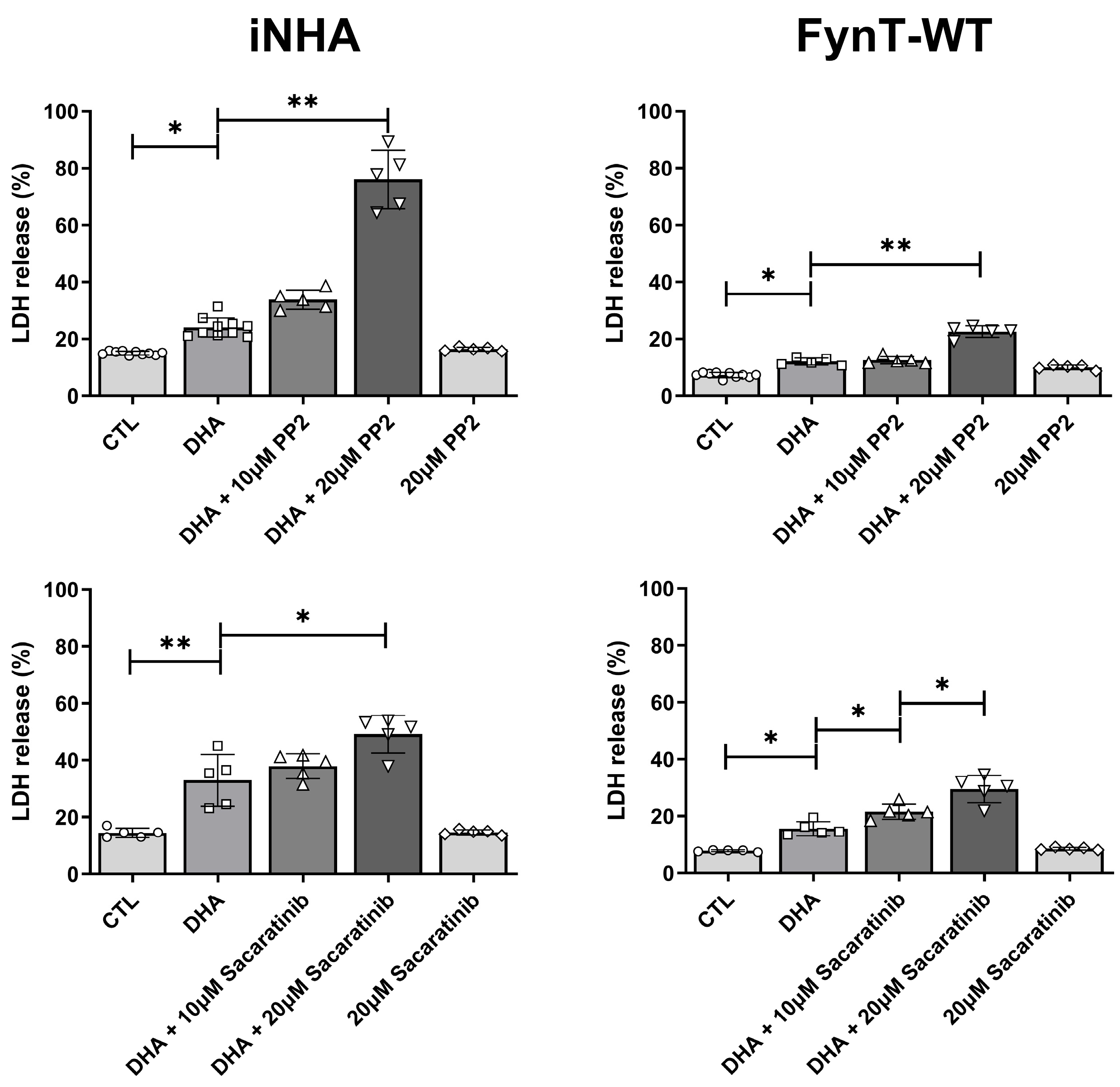 Figure 3. Fyn kinase inhibitors exacerbate DHA-induced LDH release in iNHA. Untransfected iNHA (left column) or FynT-WT clones (right column) were treated with 350 μM DHA with or without overnight pretreatment with PP2 or sacaratinib dissolved in DMSO at the concentrations indicated. Bar graphs show mean ± SD LDH release (% of the maximum LDH release from lysed cells), measured at 4 h post-DHA treatment. CTL group was treated with vehicle only (0.1% DMSO), while DHA group was treated with DHA and vehicle. * p < 0.05 or ** p < 0.01 significant pairwise comparisons using ANOVA with Bonferroni post hoc tests, based on a minimum of n = 5 independent measurements.