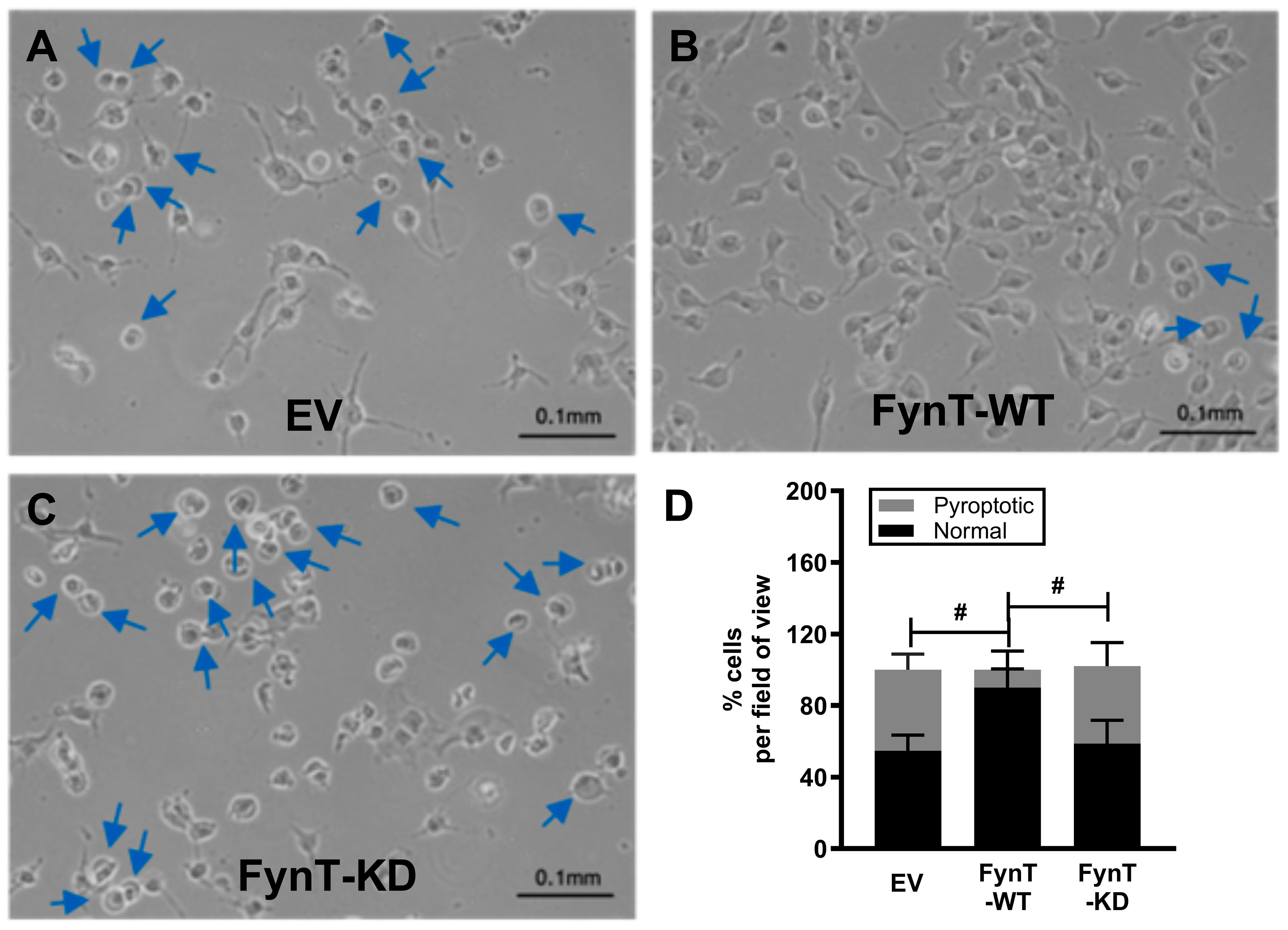 Figure 4. Representative images of iNHA (A) EV, (B) FynT-WT and (C) FynT-KD cells treated with 200 μM DHA for 2 h and monitored for morphological changes by phase-contrast microscopy at ×20 magnification. Blue arrows indicate cells exhibiting cell swelling, a characteristic of pyroptosis. (D) The stacked bar graphs display the average percentage of cell counts per field for each iNHA clone, with the black bars depicting normal cells and the grey bars depicting pyroptotic cells. # Significant difference in % pyroptotic cells between groups (p < 0.05, one-way ANOVA with Bonferroni post hoc tests).