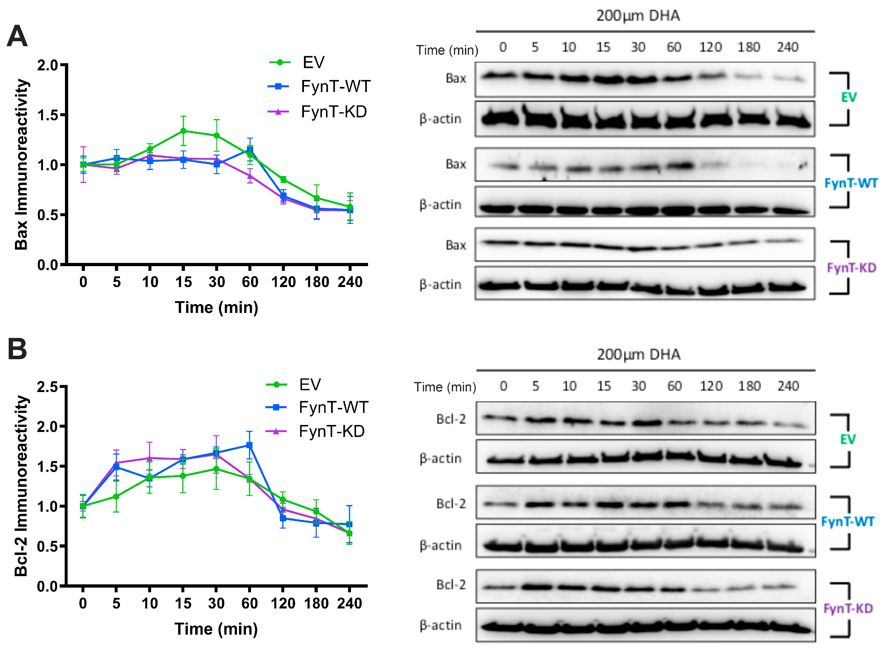 Figure 5. FynT kinase does not alter apoptotic markers in DHA-treated iNHA. Graphs depicting time-course and representative immunoblots of (A) Bax and (B) Bcl-2 across a 4 h time-course post-DHA treatment. Data presented were derived from 4 independent experiments. Values are expressed as mean ± S.E.M.