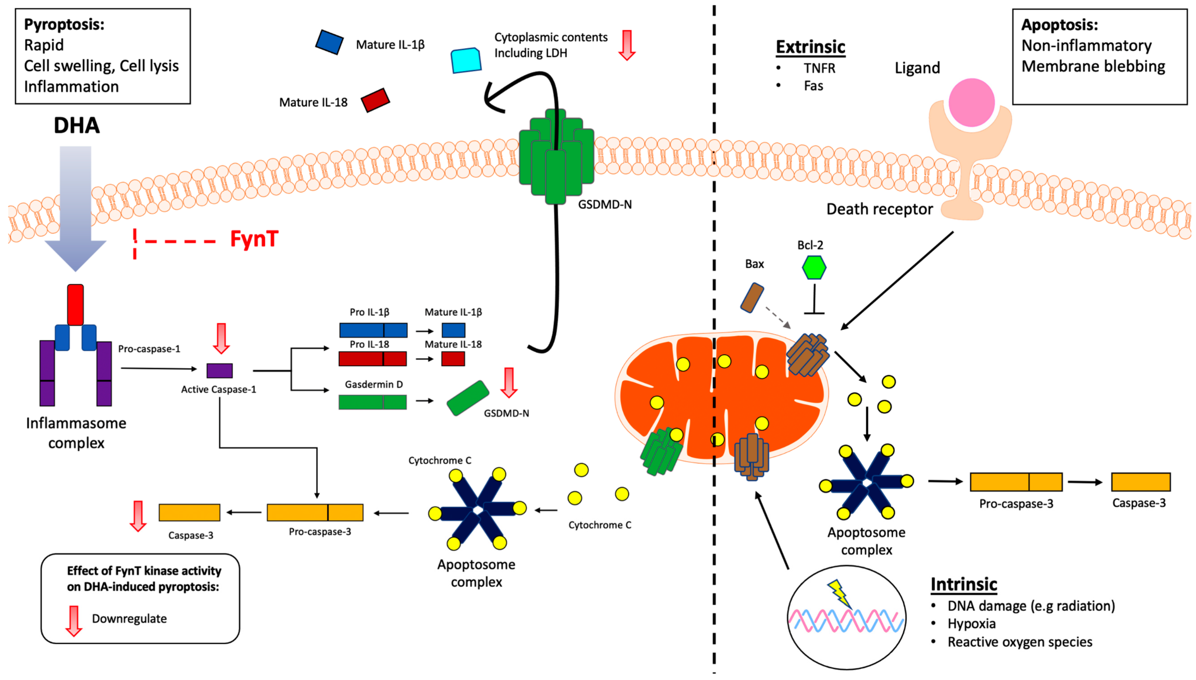 With regard to the time-course experiments, our observations of DHA-induced cleavage of caspase-1 occurred as early as 5 min, followed by GSDMD-N around 30 min and subsequent cleavage of caspase-3 at the 1–2 h time-points, before the markers returned to baseline levels (or below baseline in the case of cleaved caspase-1 and GSDMD-N, see Figure 2C) by 3–4 h, are consistent with the rapid process of classical caspase 1-mediated pyroptosis, which in turn activates downstream caspase 3 [38]. The alternate pathway, where the pore-forming GSDMD-N oligomerizes and mediates the release of cytochrome C from mitochondria, leading to downstream activation of caspase-3 [47], is also congruent with our time-course results. Even though the apoptotic markers Bax and Bcl-2 were unchanged amongst the iNHA clones (Figure 3), our findings that the apoptosis executor caspase-3 was similarly suppressed along with cleaved caspase-1 and GSDMD-N in the FynT-WT cells suggest that FynT may negatively regulate both pyroptosis and apoptosis, the latter independent of Bax/Bcl-2. However, Taabazuing et al. [38] have identified a role of caspase-3 in suppressing the release of GSDMD-N from GSDMD, thus inhibiting activation of pyroptosis. Therefore, the cleavage and activation of caspase-3 that occur with slower kinetics and after the activation of the caspase-1/GSDMD-mediated pyroptosis may serve as a counter-regulatory feedback mechanism on pyroptotic activation to aid in dampening inflammation. Furthermore, caspase-3 is also known to regulate pyroptosis in a pathway involving another member of the gasdermin family, GSDME [48]. Our results, therefore, highlight the complex regulatory relationships amongst components of the pyroptotic pathway, as well as the bidirectional crosstalk between pyroptosis and apoptosis. Figure 6 provides a schematic overview of how FynT kinase may putatively regulate DHA-induced pyroptosis based on this study’s findings.