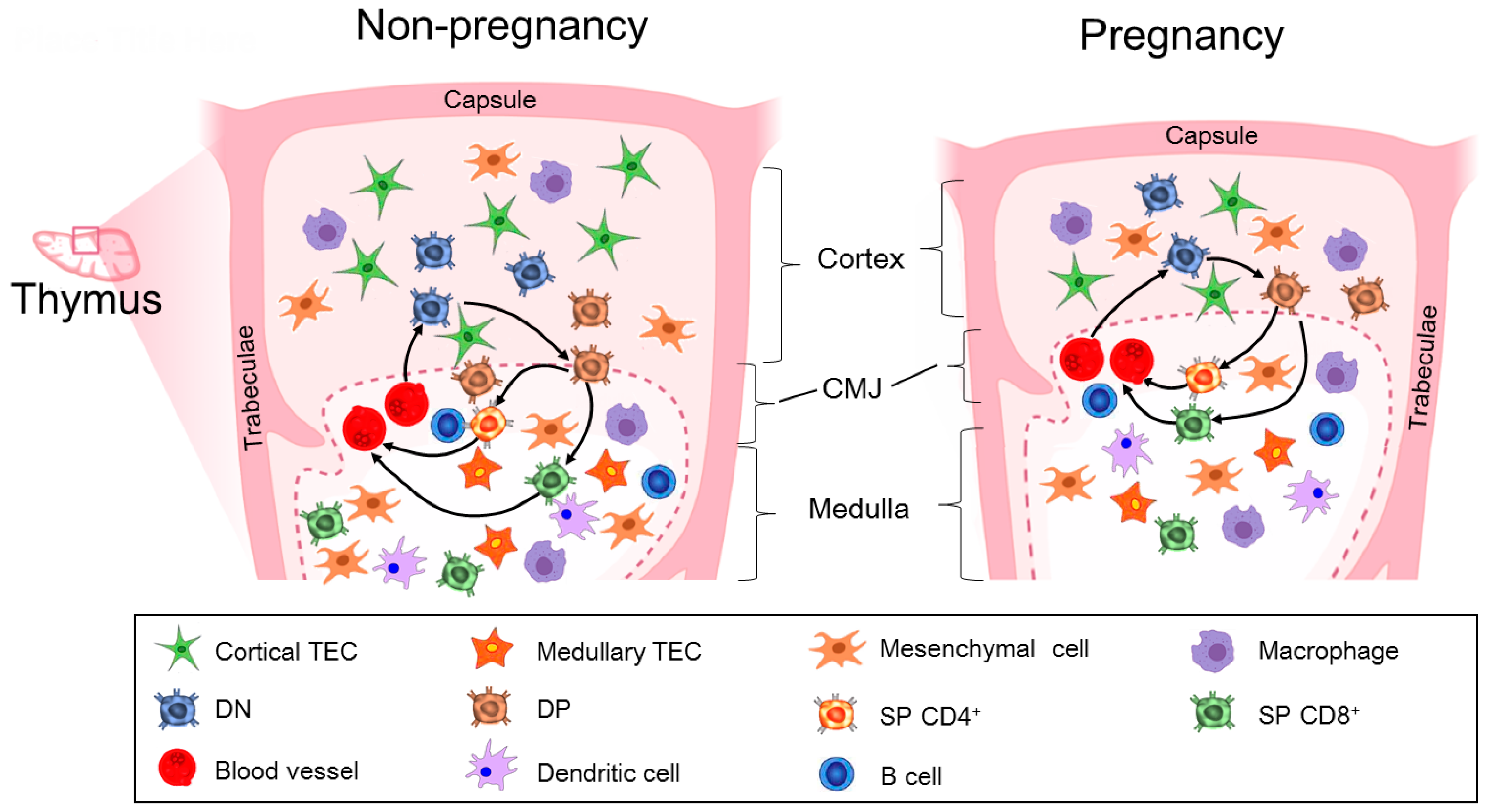 α/β and γ/δ double negative T-cells | Thymocyte loss and thymic involution | Maintenance of pregnancy | Humans and mice | [44] |