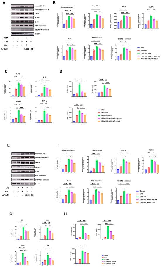 Auranofin attenuates MSU-induced NLRP3 inflammasome activation in human THP-1 macrophages and murine BMDMs. (A) Representative immunoblotting images of cleaved caspase-1, cleaved IL-1β, TNF-α, NLRP3, IL-18, ASC monomer, and GSDMD-N in THP-1 cells. (B) Densitometric quantification of immunoblotting data in THP-1 cells. (C) Relative mRNA expression of IL1B, IL18, TNF, and NLRP3 measured by qPCR in THP-1 cells. (D) ELISA results for secreted IL-1β, IL-18, and TNF-α in THP-1 culture supernatants. (E) Representative immunoblotting images in murine BMDMs. (F) Quantification of immunoblotting data in BMDMs. (G) Relative mRNA expression of Il1b, Il18, Tnf, and Nlrp3 in BMDMs. (H) ELISA results for IL-1β, IL-18, and TNF-α secretion in BMDMs. Data are presented as mean ± SEM from five independent experiments. * p < 0.05; ** p < 0.01; *** p < 0.001.