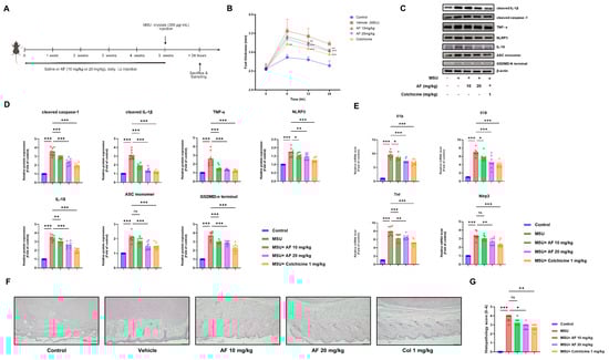 Mice received daily intraperitoneal injection of auranofin (10 or 20 mg/kg) or saline for 5 weeks [25,26,35,36,37]. Subsequently, MSU crystals (300 μg in 0.1 mL PBS) were injected into the right hind paw as previously described [34]. Colchicine (1 mg/kg) was administered intraperitoneally 1.5 h before injection of MSU crystals. Paw thickness was measured both pre-injection and 24 h post-injection. Paws were collected for histological, protein, and gene expression analyses.