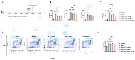 Auranofin suppresses MSU crystal-induced inflammation and neutrophil infiltration in a mouse air-pouch model. (A) Experimental timeline for the air-pouch model and auranofin treatment. (B) Concentrations of IL-1β, IL-18, TNF-α, and CXCL1 in air-pouch lavage fluid. (C) Myeloperoxidase (MPO) activity in lavage fluid. (D) Flow cytometric analysis of CD11b+Ly6G+ neutrophils in air-pouch exudates. (E) Quantification of CD11b+Ly6G+ cell populations in (D). Data represent mean ± SEM of at least three independent experiments. * p < 0.05; ** p < 0.01; *** p < 0.001.