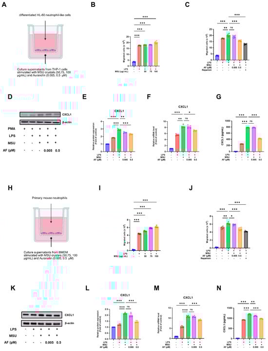 To validate these findings in murine cells, supernatants from MSU-stimulated BMDMs were used as chemoattractants in a Transwell migration assay with primary mouse neutrophils (Figure 4H). Auranofin-treated BMDMs exhibited reduced chemotactic activity, as indicated by decreased numbers of migrated neutrophils (Figure 4I,J). In parallel, auranofin diminished CXCL1 expression at both protein and mRNA levels, as shown by immunoblotting, ELISA, and qPCR (Figure 4K–N).