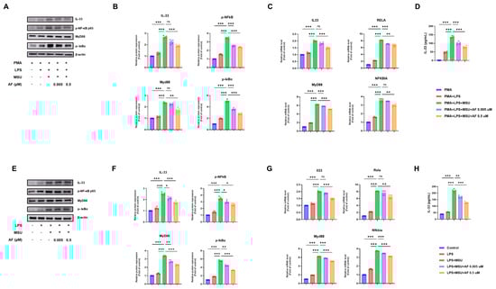 Auranofin suppresses neutrophilic inflammation by inhibiting the IL-33/ST2 signaling pathway. (A) Immunoblot analysis IL-33, phosphorylated NF-κB p65, MyD88, and phosphorylated IκBα in MSU-stimulated THP-1 cells with or without auranofin. (B) Densitometric quantification of immunoblotting data in THP-1 cells. (C) Relative mRNA expression levels of IL33, NFKBIA (encoding IκBα), MYD88, and RELA (encoding NF-κB p65) in THP-1 cells. (D) IL-33 concentrations in THP-1 supernatants measured by ELISA. (E) Immunoblot analysis of IL-33, phosphorylated NF-κB p65, MyD88, and phosphorylated IκBα in MSU-stimulated BMDMs with or without auranofin. (F) Densitometric quantification of immunoblotting data in BMDMs. (G) Relative mRNA expression levels of Il33, Nfkbia, Myd88, and Rela in BMDMs. (H) IL-33 concentrations in BMDM supernatants measured by ELISA. Data represent mean ± SEM of five independent experiments. * p < 0.05; ** p < 0.01; *** p < 0.001. ns, not significant.