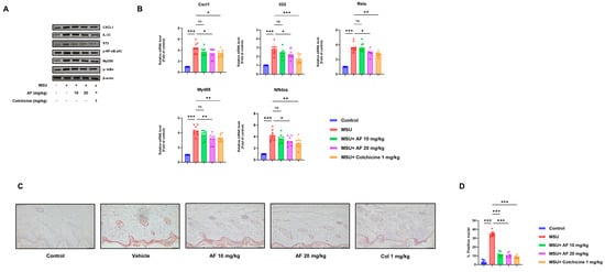 We next examined auranofin in vivo using a mouse air-pouch gout model to further characterize its anti-inflammatory effects. As illustrated in the experimental scheme (Figure 3A), auranofin was administered daily for 5 weeks prior to MSU crystal injection. Auranofin treatment significantly reduced the levels of IL-1β and IL-18 in serum compared to MSU-treated controls (Supplementary Figure S2B).