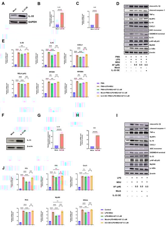 IL-33 overexpression overrides the anti-inflammatory effects of auranofin in human and murine macrophages. (A) Immunoblot analysis of IL-33 protein levels in mock- and IL-33-transfected THP-1 cells. (B) Densitometric quantification of IL-33 expression shown in A. (C) Relative mRNA expression of IL33 in mock- and IL-33-transfected THP-1 cells. (D) Representative immunoblotting images of cleaved IL-1β, cleaved caspase-1, TNF-α, NLRP3, IL-18, CXCL1, ASC monomer, GSDMD-N, IL-33, phosphorylated NF-κB p65 (p-p65), MyD88, and phosphorylated IκBα in THP-1 cells treated under five conditions: (1) PMA only; (2) PMA + LPS + MSU; (3) PMA + LPS + MSU + auranofin; (4) IL-33 mock + PMA + LPS + MSU + auranofin; and (5) IL-33 overexpression + PMA + LPS + MSU + auranofin. (E) Relative mRNA expression of IL1B, IL18, CXCL1, RELA (encoding NF-κB p65), MYD88, and NFKBIA (encoding IκBα) in THP-1 cells treated, as in (D). (F) Representative immunoblotting images of IL-33 protein levels in mock- and IL-33-transfected RAW264.7 cells. (G) Densitometric quantification of IL-33 expression shown in (A). (H) Relative mRNA expression of IL33 in mock- and IL-33-transfected THP-1 cells. (I) Immunoblot analysis of cleaved IL-1β, cleaved caspase-1, TNF-α, NLRP3, IL-18, CXCL1, ASC monomer, GSDMD-N, IL-33, phosphorylated NF-κB p65 (p-p65), MyD88, and phosphorylated IκBα in RAW264.7 cells treated under five conditions: (1) control; (2) LPS + MSU; (3) LPS + MSU + auranofin; (4) IL-33 mock + LPS + MSU + auranofin; and (5) IL-33 overexpression + LPS + MSU + auranofin. (J) Relative mRNA expression of Il1b, Il18, Cxcl1, Rela (encoding NF-κB p65), Myd88, and Nfkbia (encoding IκBα) in RAW264.7 cells treated, as in (D). Data represent mean ± SEM from at least five independent experiments. * p < 0.05, ** p < 0.01, *** p < 0.001, **** p < 0.0005, vs. MSU; # p < 0.05, ## p < 0.01, ### p < 0.001 vs. Mock; ns, not significant.