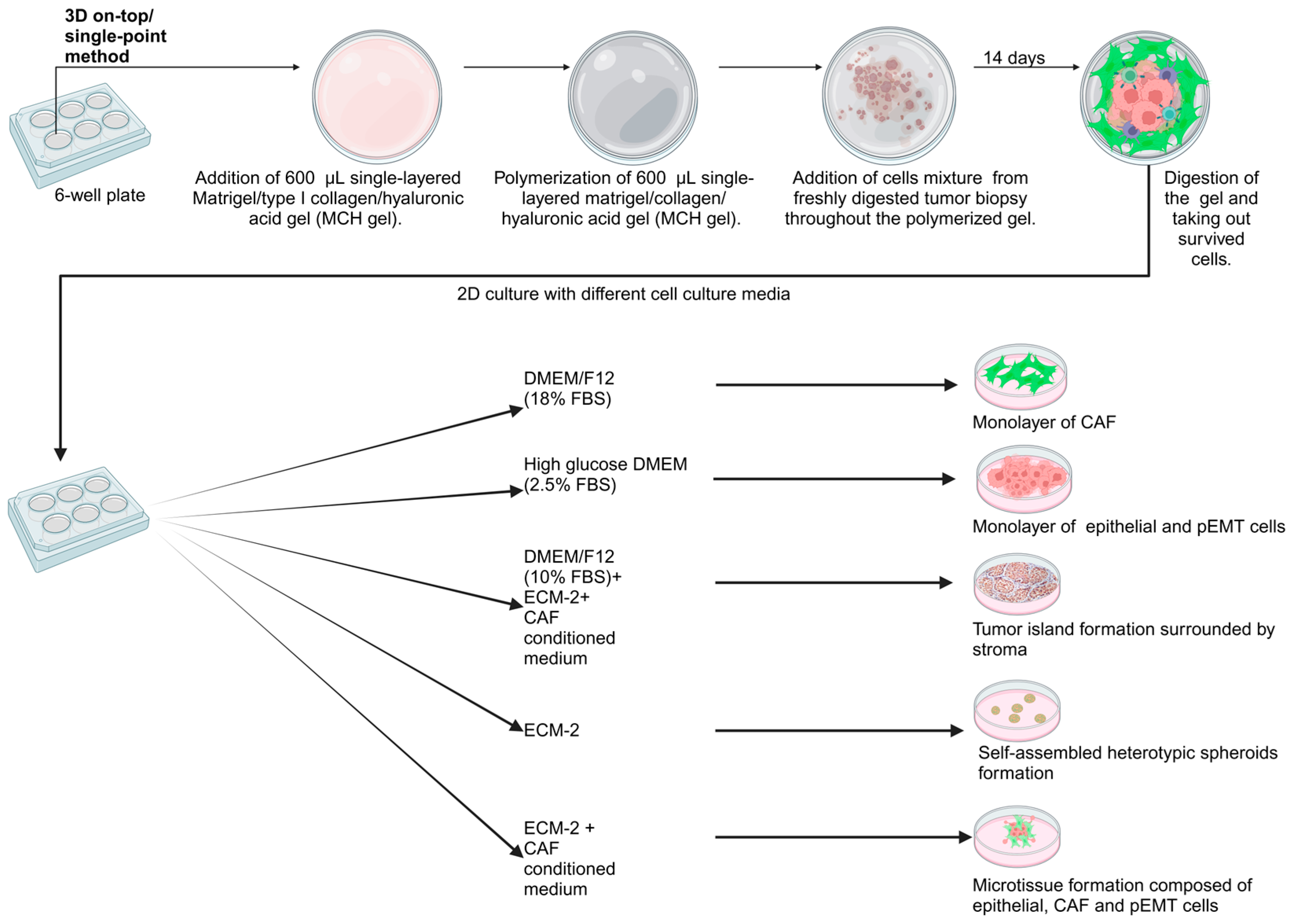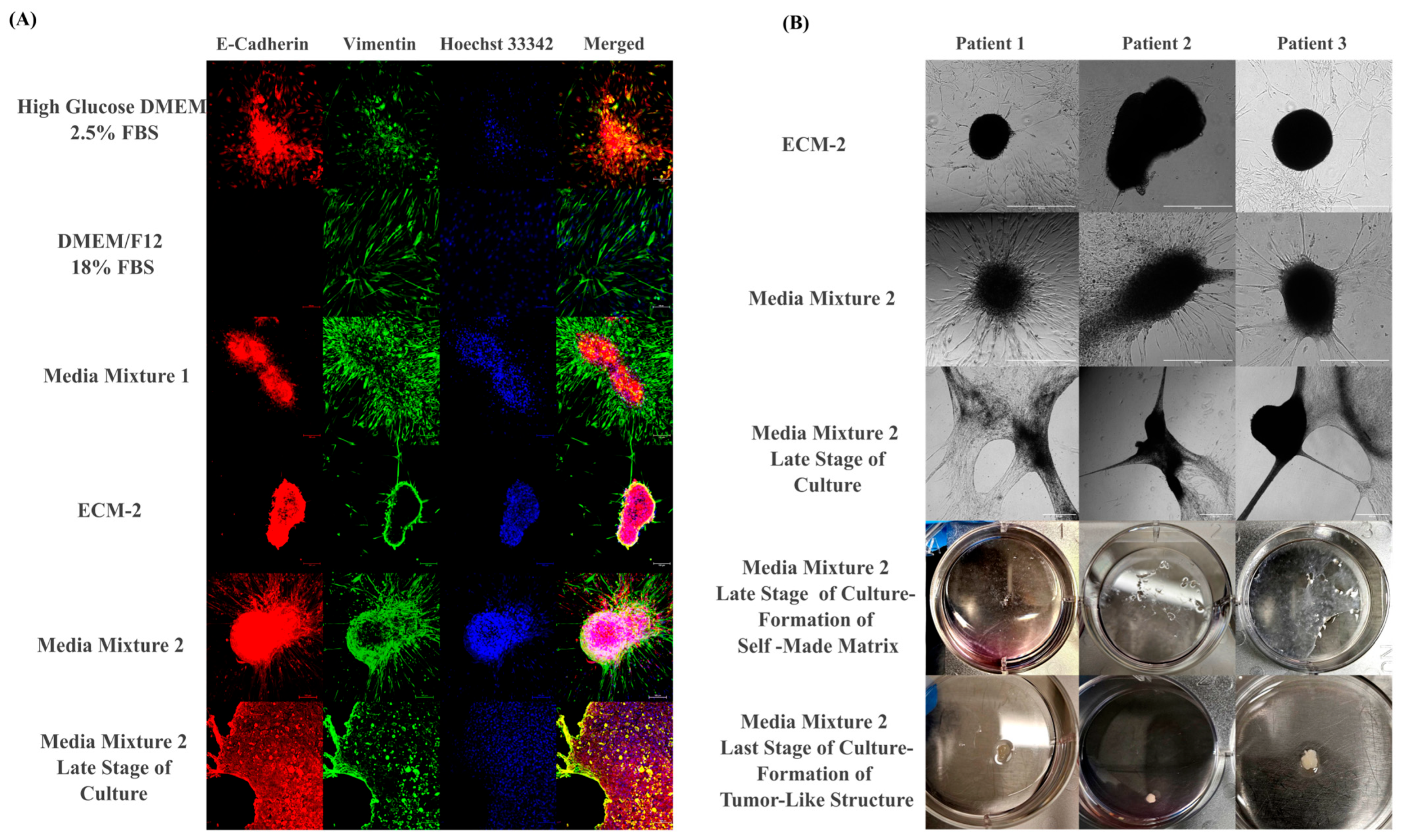 - Next, we aimed to investigate whether different culture media could allow us to recapitulate the invasive features observed with tumoroids in 3D cultures. Here, we aimed to prevent undesired matrix degradation and contraction, combined with the adhesion of hyperactive CAFs at the bottom of the plates. Since this was preferentially observed with collagen or Matrigel/collagen type I mixed gels, we decided to switch to pure Matrigel for this purpose. Accordingly, cells from patient one were cultured using the 3D sandwich/single-point cell seeding method in 4 mg/mL pure Matrigel, testing the following media conditions: (a) DMEM High Glucose with 2.5%FBS, (b) DMEM/F12 with 10% FBS, (c) complete Endothelial Cell Growth Medium 2 (ECM-2), and (d) Media Mix 2 (a 1:1 combination of full ECM-2 and CAFs-conditioned DMEM/F12 with 10% FBS). The IF staining was performed as described previously [16]. The IF staining was performed as described previously [16].