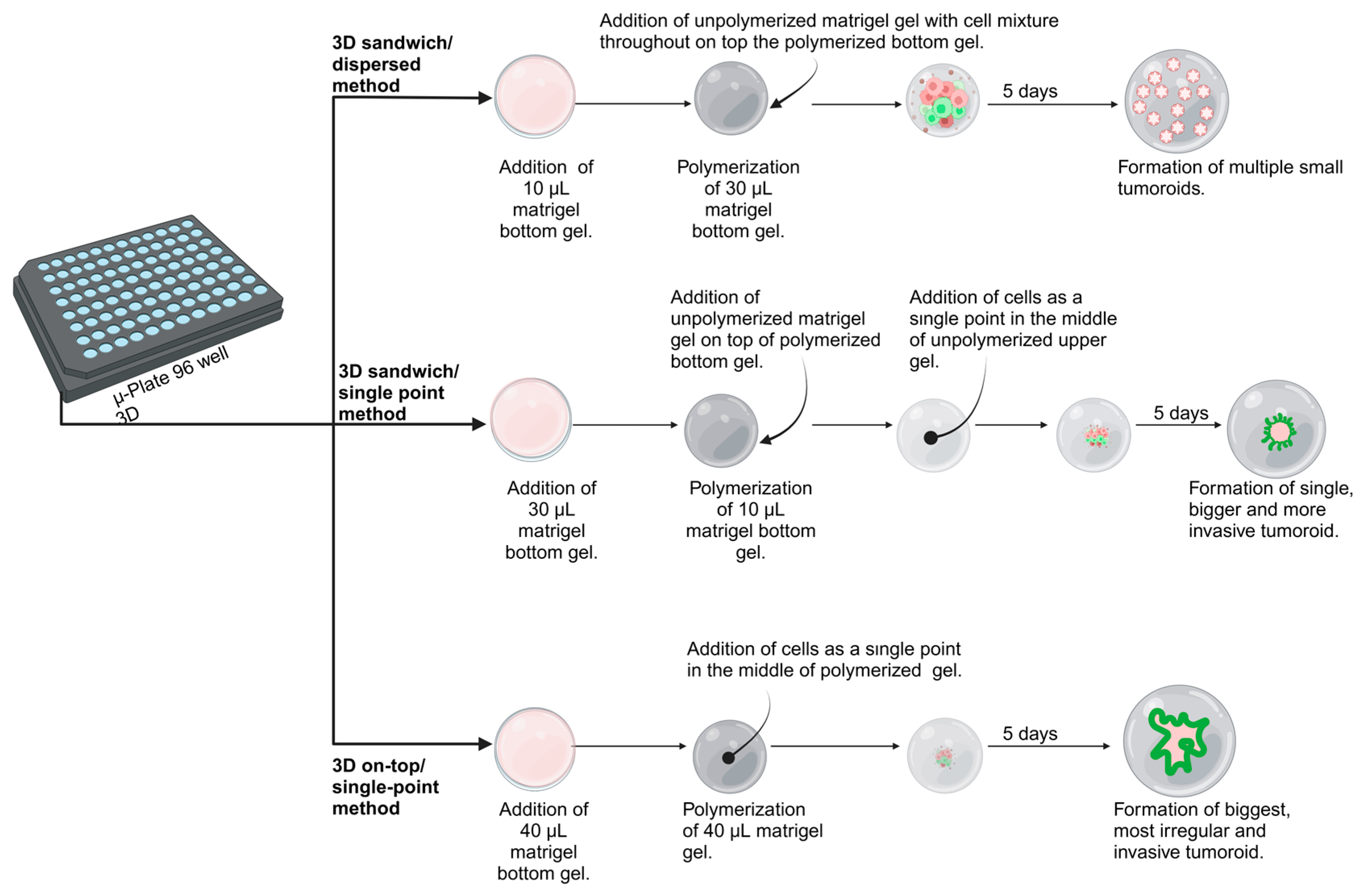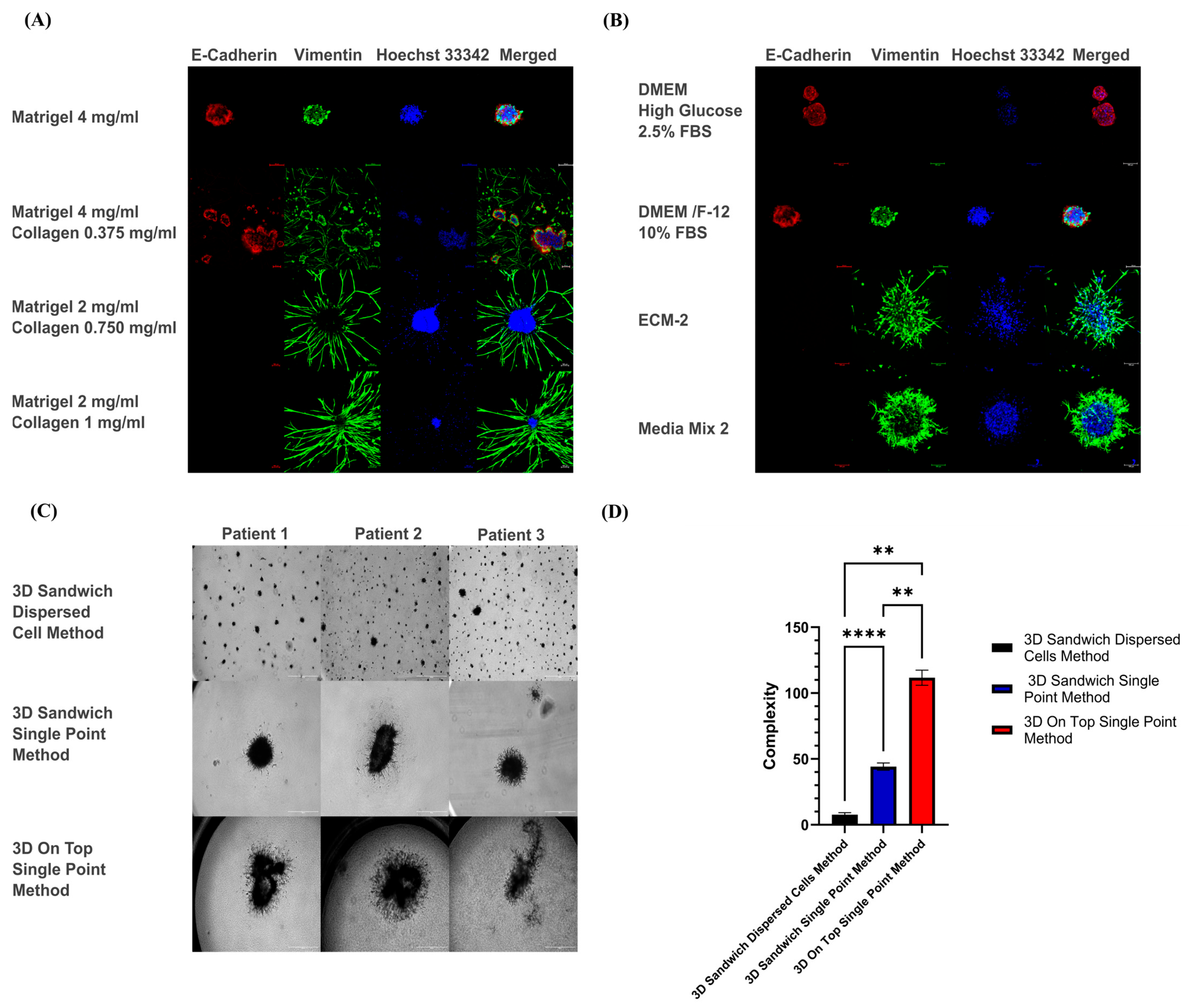 - To evaluate the effects of different gel compositions, the 3D sandwich/single-point method was chosen initially for patient 1. The settings were prepared by first placing 30 µL of the bottom gel into each well, allowing the gel to polymerize for 2 h, followed by the addition of 10 µL of unpolymerized gel on top. Before polymerization, 5000 cells were injected with 5 µL of media into the center of the upper gel, where they formed a dense cell cluster. Four gel compositions were tested in DMEM/F12 with 10% FBS: (a) 4 mg/mL pure Matrigel, (b) 4 mg/mL Matrigel + 0.375 mg/mL collagen I, (c) 2 mg/mL Matrigel + 0.75 mg/mL collagen I, and (d) 2 mg/mL Matrigel + 1 mg/mL collagen I