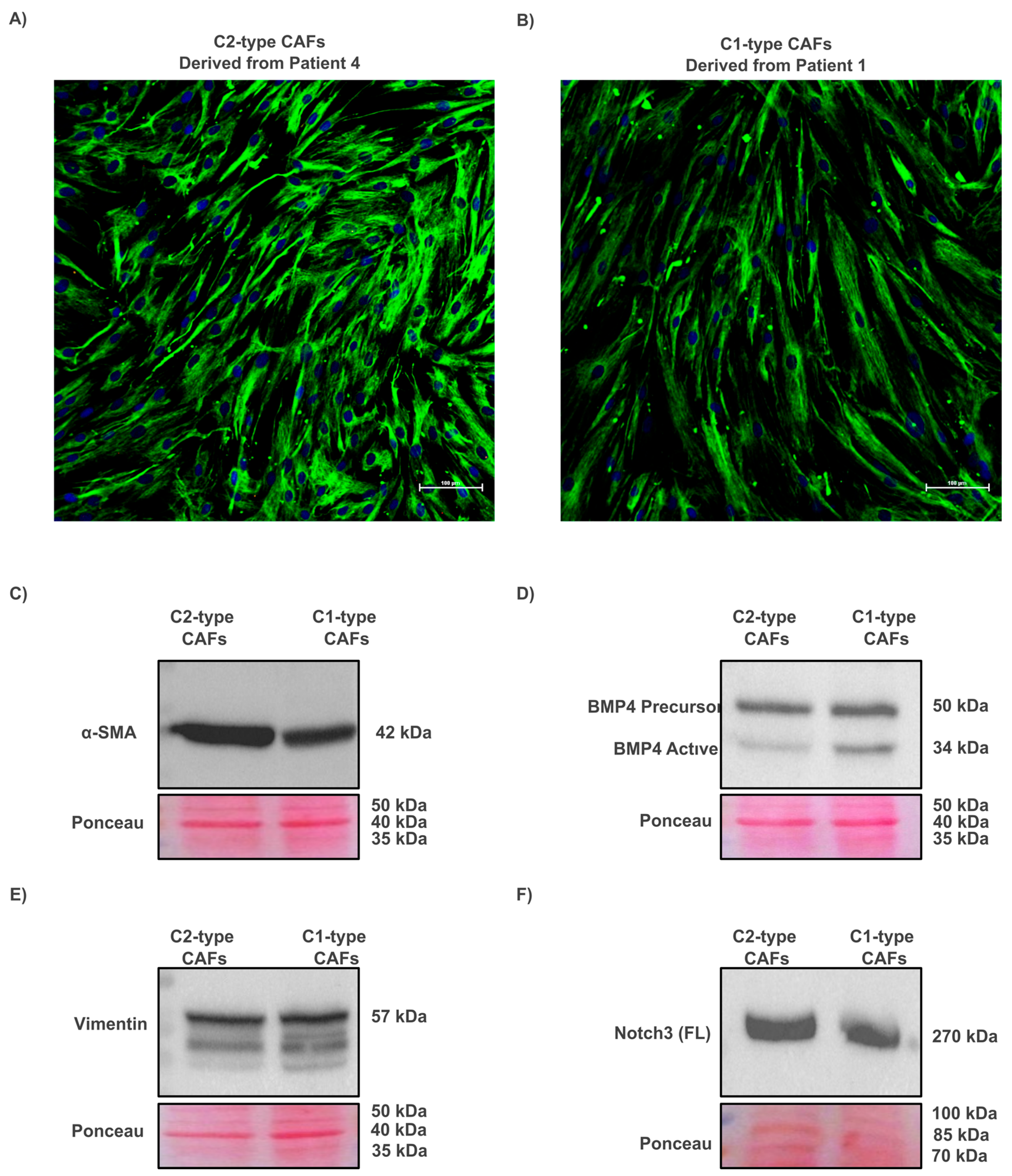 3.1. Identification of C1 and High α-SMA C2 Subtypes of CAFs by IF Staining and Western Blot