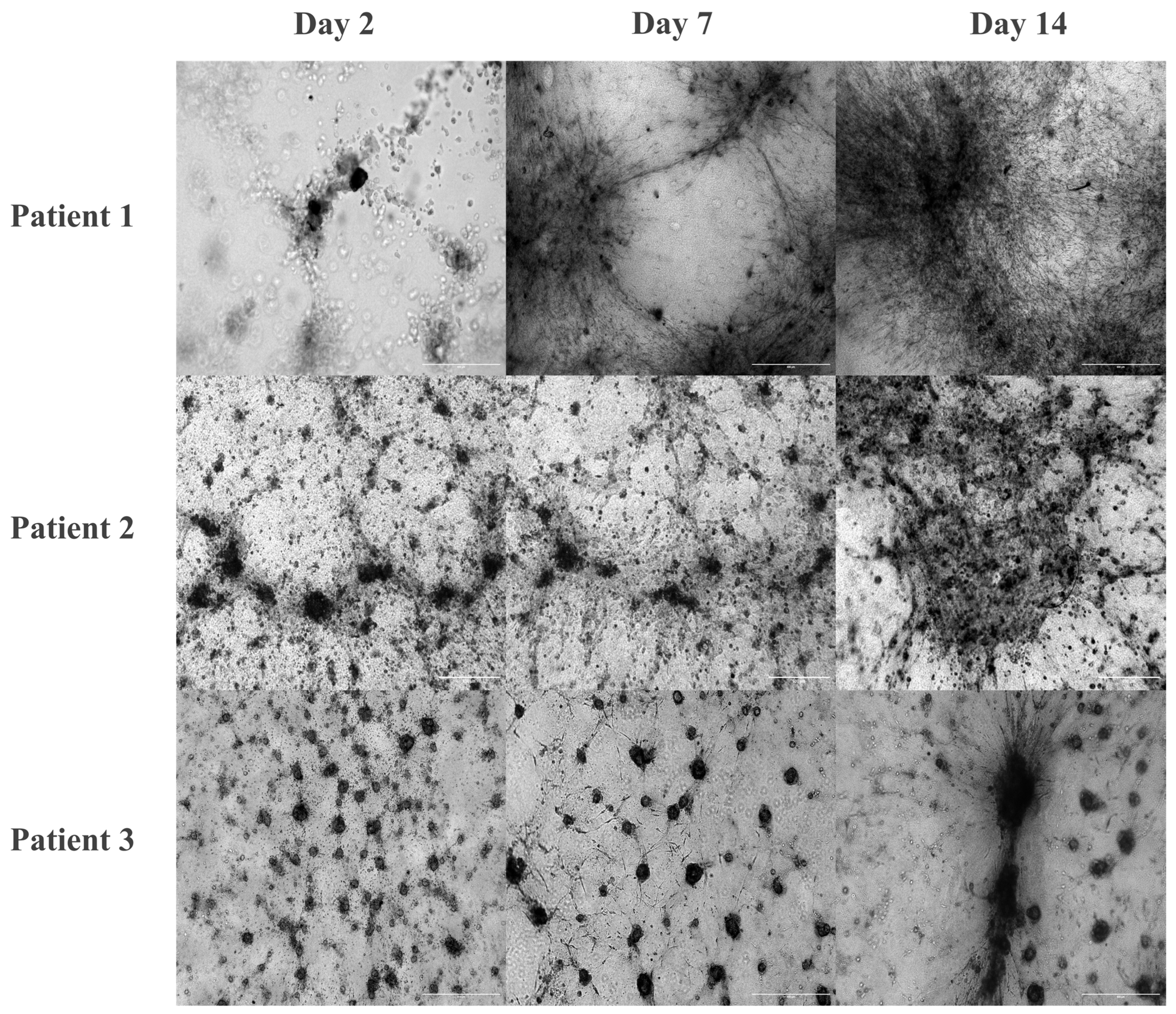 - Lastly, we assessed the effects of oxygen and nutrient availability on each patient’s culture. For patients 2 and 3, the 3D sandwich/single-point method reproduced the most complex tumoroid morphology previously seen in patient 1. In contrast, the 3D sandwich/dispersed method resulted only in small, poorly developed, and slowly growing organoids, while the 3D on-top/single-point method produced the most complex, fast-growing, and irregular tumoroids, closely resembling native tumor architecture (Figure 7C). In addition to nutrient and oxygen gradients, the higher local cell density in single-point cultures may also increase cell–cell contacts, which could contribute to the more complex tumoroid phenotypes observed.