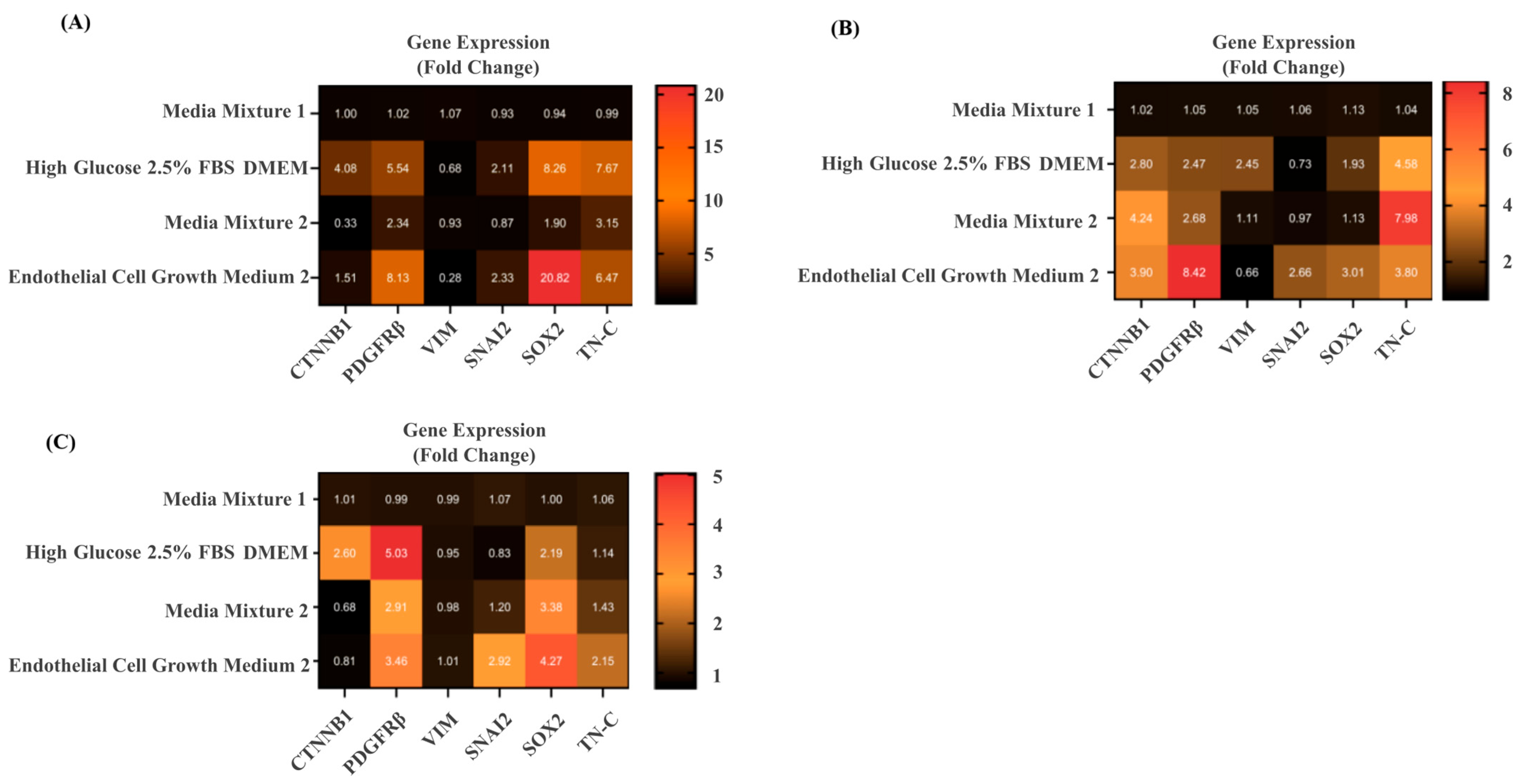 3.4. qPCR Analysis Reveals Different Cell Types and Differentiation Stages Resulting from 2D Tissue-like Cultures Treated with Different Media Compositions