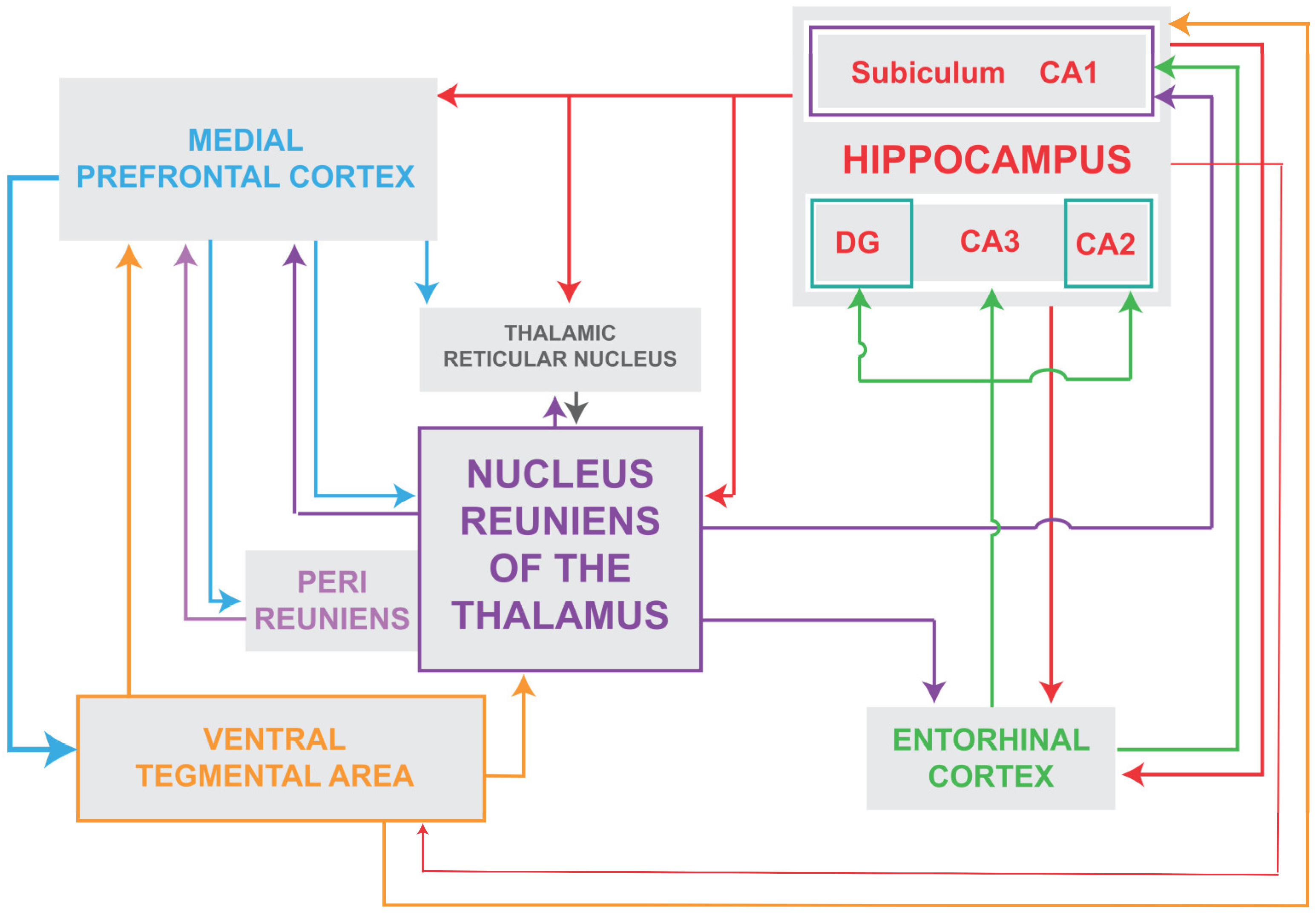 - Cassel, J.C.; Ferraris, M.; Quilichini, P.; Cholvin, T.; Boch, L.; Stephan, A.; Pereira de Vasconcelos, A. The reuniens and rhomboid nuclei of the thalamus: A crossroads for cognition-relevant information processing? Neurosci. Biobehav. Rev. 2021, 126, 338–360. [Google Scholar] [CrossRef]