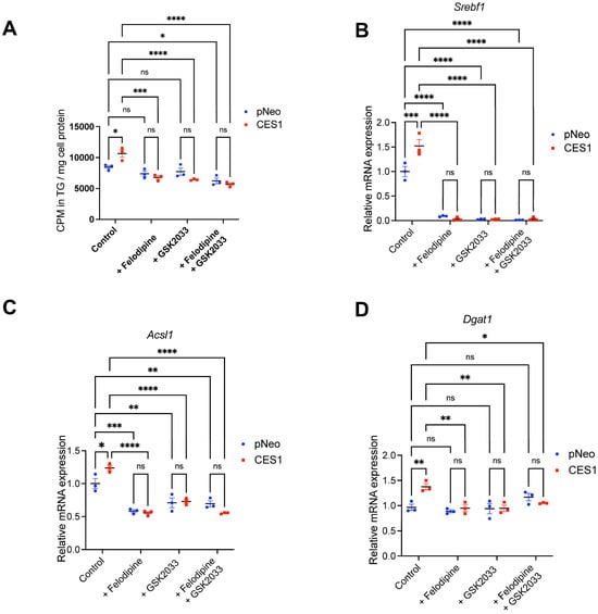 Expression of genes encoding lipogenic regulators LXRα and LXRβ and LXRα/β target gene Abca1 was upregulated in CES1 cells (Figure 2B). The expression of another LXR target gene Cyp27a1 was also upregulated in CES1 cells (Figure 4A). Ablation of CES1 expression in THP-1 cells reduced the production of 27-hydroxycholesterol (27-HC) via CYP27A1 [25]. This oxysterol is a potent ligand and activator of LXR [26,27,28], and therefore, we hypothesized that increased OA esterification to TG and increased TG storage in CES1 cells could be additionally due to augmented CYP27A1-mediated activation of the LXR pathway. To test this hypothesis, we employed a specific inhibitor of CYP27A1 Felodipine [29] and the LXR antagonist GSK2033. Felodipine significantly reduced CES1-mediated expression of Cyp27a1 and LXR target gene Abca1 to control pNeo cell levels (Figure 4A,B). We also determined the effects of Felodipine and GSK2033 on CYP27A1 protein expression. Surprisingly, there was no statistical difference between pNeo and CES1 cells in CYP27A1 protein abundance, while individual treatments with Felodipine or GSK2033 slightly decreased CYP27A1 abundance in pNeo cells but not in CES1 cells (Figure 4C). These results suggest that CES1 expression increased Cyp27a1 and Abca1 mRNA abundance without altering CYP27A1 protein levels.