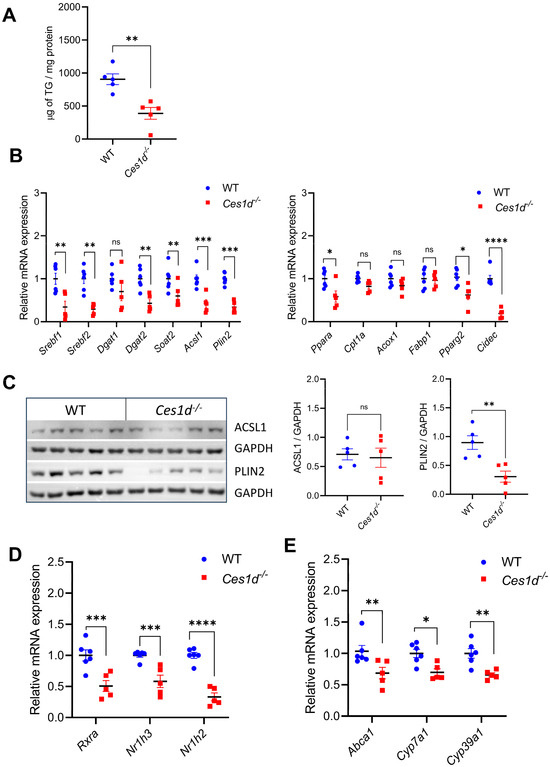 Ces1d deficiency results in decreased hepatic TG storage and expression of genes encoding transcription factors and enzymes responsible for neutral lipid synthesis and storage. Male WT (C57BL/6J) and Ces1d−/− mice (n = 5) were fed HFD for 16 weeks from the age of 4 weeks. Data are means ± SEM. ns, not significant, * p < 0.05, ** p < 0.01, *** p < 0.001 and **** p < 0.0001. (A) Hepatic TG concentration determined by HPLC. (B) Hepatic mRNA abundance of genes encoding transcription factors, proteins and enzymes regulating neutral lipid synthesis, storage and oxidation determined by qPCR. (C) Hepatic ACSL1 and LD coat protein PLIN2 expression in HFD-fed WT and Ces1d−/− mice was assessed by immunoblotting. Immunoblotting of GAPDH served as a loading control. (D) Hepatic mRNA abundance of genes encoding transcription factors RXR and LXRα/β. (E) Hepatic mRNA abundance of LXR target genes Abca1, Cyp7a1 and Cyp39a1. (F) Abundance of hepatic Cyp27a1 mRNA and CYP27A1 protein. Immunoblotting of GAPDH served as a loading control. (G) Hepatic concentrations of total, free and ester forms of oxysterols determined by LC-MS/MS.