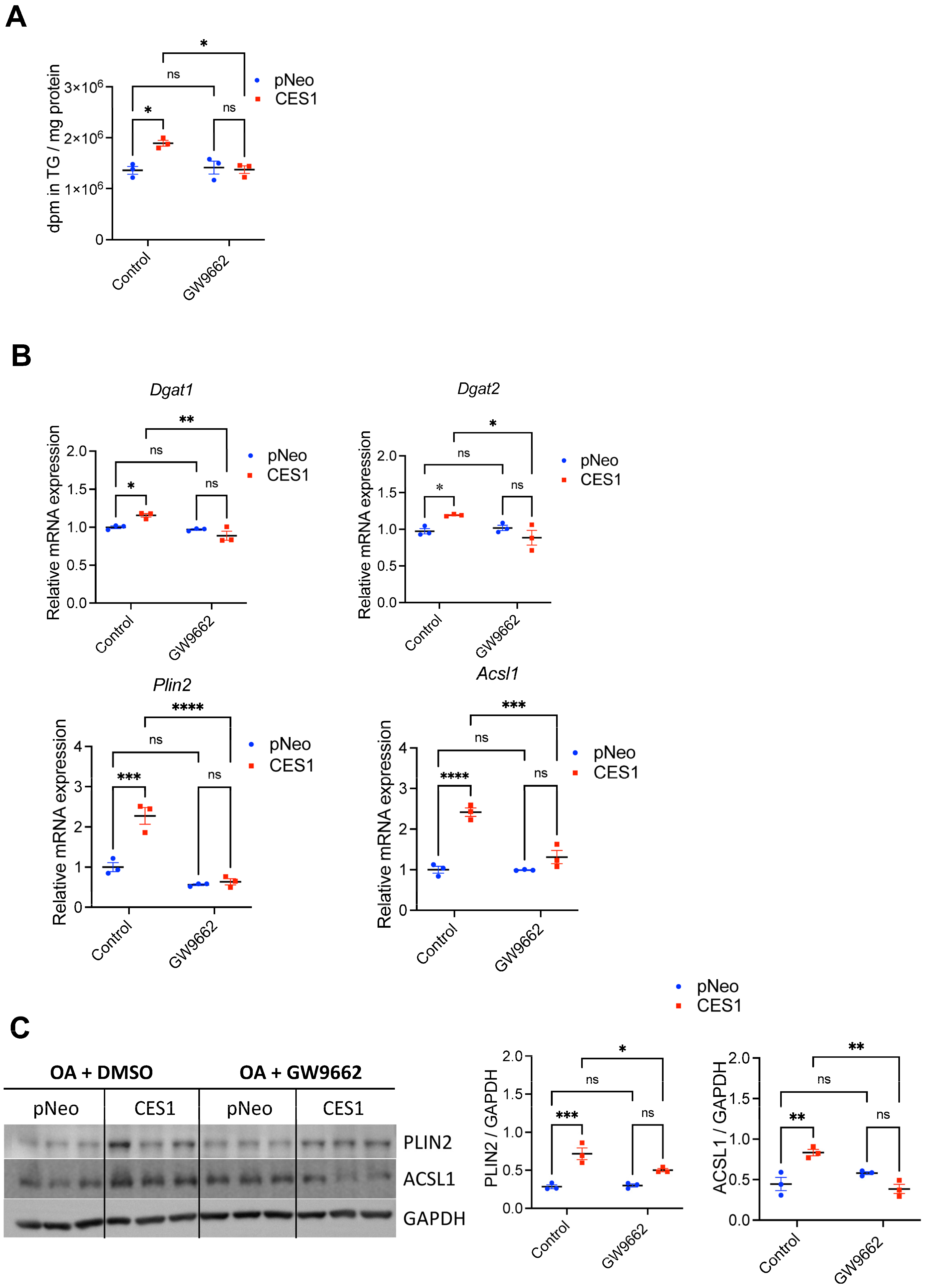 3.2. CES1 Enhances Expression of Genes Encoding Lipogenic Transcription Factors and Enzymes Catalyzing Fatty Acid Activation and Neutral Lipid Synthesis