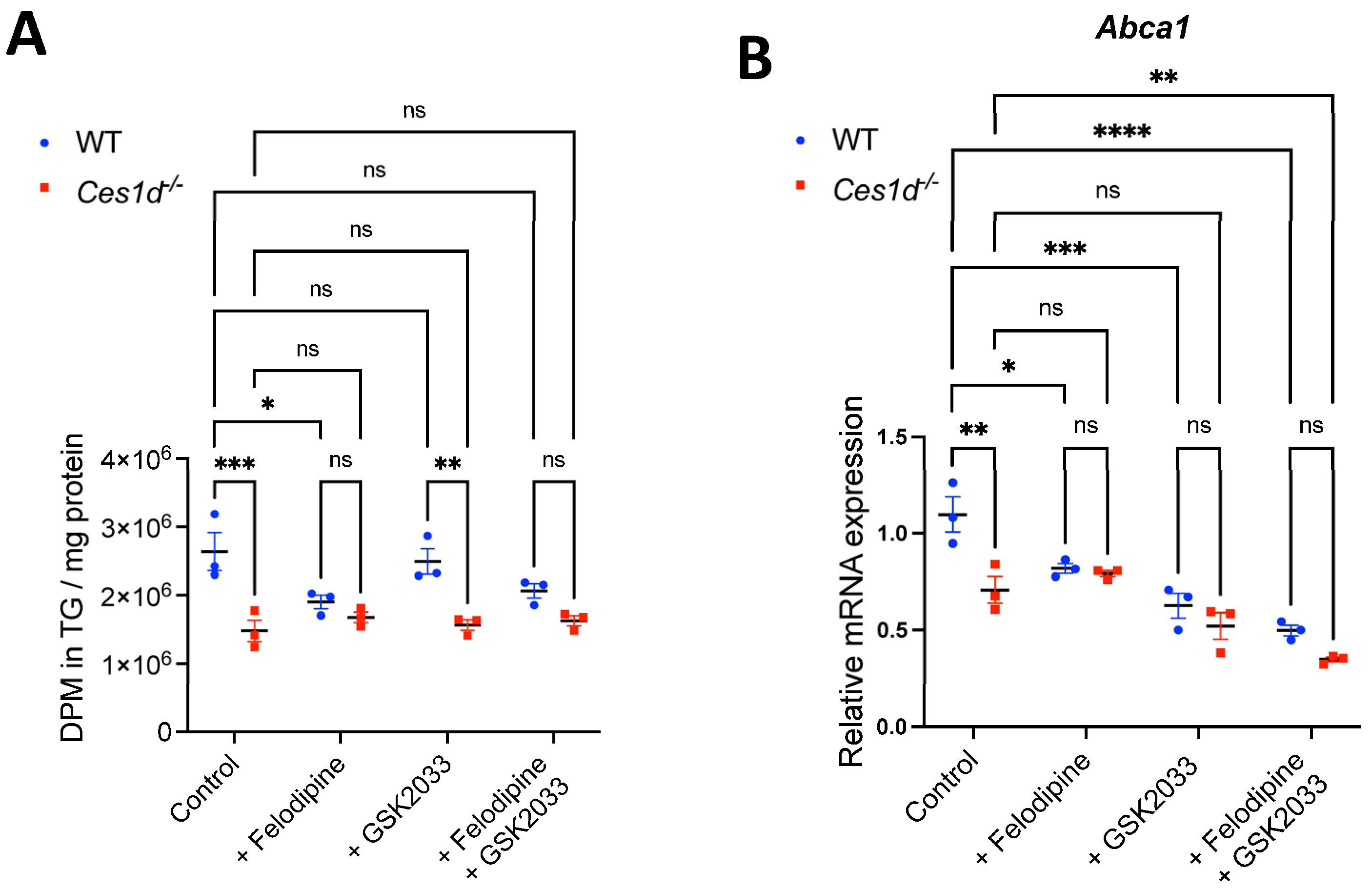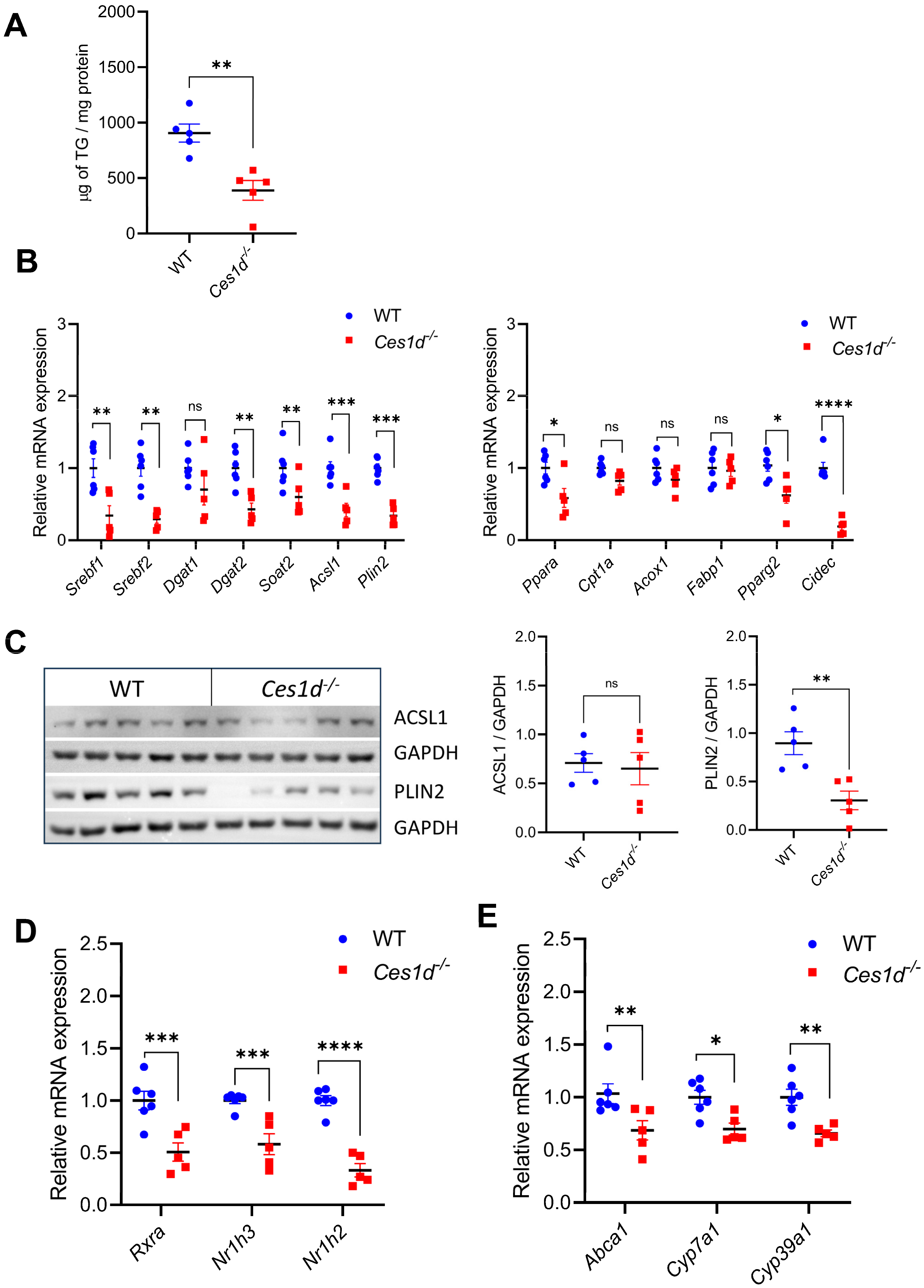 3.5. Ces1d Deficiency Reduces Neutral Lipid Synthesis and Srebf1c, Nr1h2, Nrh1h3, and Rxra Expression