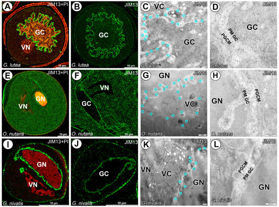 Arabinogalactan proteins identified by the JIM14 monoclonal antibody are primarily localized around the generative cell of G. lutea and within the cytoplasm of the vegetative cell (Figure 7A–C). In contrast, a lack of signal from the JIM14 monoclonal antibody was noted in the generative cell of O. nutans, with only a punctate signal detected in the cytoplasm of the vegetative cell (Figure 7D). Furthermore, arabinogalactan proteins recognized by the JIM14 monoclonal antibody were solely visualized surrounding the generative cell of G. nivalis (Figure 7E,F).