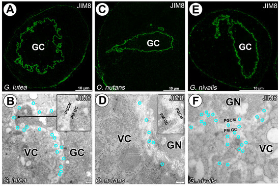 Figure 3. Arabinogalactan proteins detected with JIM8 mAbs in G. lutea (A,D), O. nutans (B,E) and G. nivalis (C,F) mature pollen grains. (A) Arabinogalactan proteins recognized with JIM8 mAb surrounding only G. lutea generative cell. (B) Arabinogalactan proteins recognized with JIM8 mAb surrounding only O. nutans generative cell. (C) Arabinogalactan proteins recognized with JIM8 mAb surrounding only G. nivalis generative cell. (D) Arabinan epitope recognized with JIM8 mAb surrounding only G. lutea generative cell, the zoomed-in area presented in (D) is taken from different regions of the same pollen grain (E) Arabinan epitope recognized with JIM8 mAb surrounding only O. nutans generative cell. (F) Arabinan epitope recognized with JIM8 mAb surrounding only G. nivalis generative cell. (GC)—generative cell, (GN)—generative nucleus, (VC)—vegetative cell nucleus, (PGCM)—peri-germ cell membrane, (PM GC)—plasma membrane of generative cell. Representative gold grains were marked with a light cyan circle for better clarity.