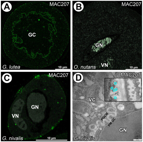 Figure 5. Arabinogalactan proteins detected with MAC207 in G. lutea (A), O. nutans (B) and G. nivalis (C,D) mature pollen grains (green fluorescence). (A) Arabinogalactan proteins recognized with MAC207 mAb surrounding G. lutea generative cell and within of vegetative cell cytoplasm. (B) Lack of signal from MAC207 mAb in O. nutans pollen grain. (C) Lack of signal from MAC207 mAb surrounding G. nivalis generative cell; vegetative cell cytoplasm only has visible patches of signal under sporoderm (D). (GC)—generative cell, (GN)—generative cell nucleus, (VN)—vegetative cell nucleus. (B,C)—gray signal represents autofluorescence of generative and vegetative cell nucleus and sporoderm. (PGCM)—peri-germ cell membrane, (PM GC)—plasma membrane of generative cell. Representative gold grains were marked with a light cyan circle for better clarity.