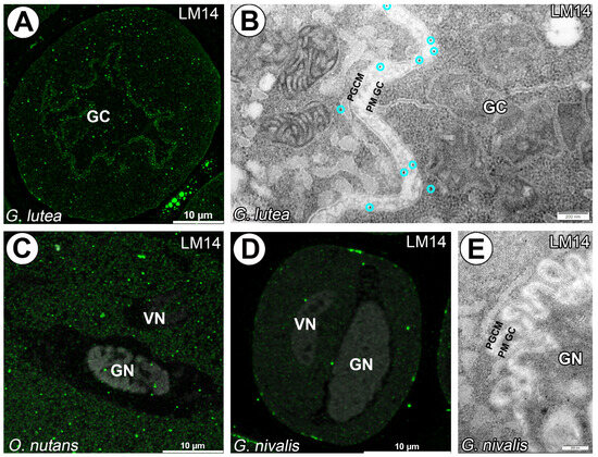 Figure 6. Arabinogalactan proteins recognized with LM14 mAb surrounding G. lutea generative cell and within of vegetative cell cytoplasm (green fluorescence). (A,B) Lack of signal from LM14 mAb in O. nutans generative cell, punctate signal only detected in vegetative cell cytoplasm. (C) Lack of signal from LM14 mAb surrounding G. nivalis generative cell, vegetative cell cytoplasm, only visible patches of signal under sporoderm (D,E). (GC)—generative cell, (GN)—generative cell nucleus, (VN)—vegetative cell nucleus, (PGCM)—peri-germ cell membrane, (PM GC)—plasma membrane of generative cell. (C,D)—gray signal represents autofluorescence of generative and vegetative cell nucleus and sporoderm. Representative gold grains were marked with a light cyan circle for better clarity.