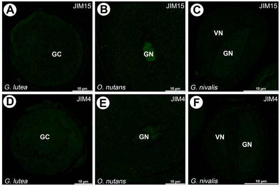Figure 8. Absence of signal of JIM15 (AC) and JIM4 (DF) observed in all examined species. (GC)—generative cell, (GN)—generative nucleus, (VC)—vegetative cell nucleus.