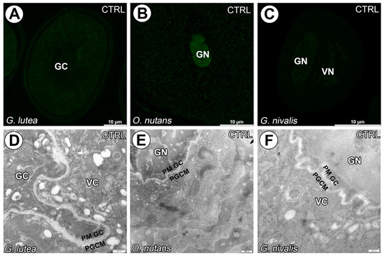 Figure 4. Arabinogalactan proteins detected with LM2 mAb in G. lutea, G. nivalis and O. nutans mature pollen grains. (A,D) Arabinogalactan proteins detected surrounding only G. lutea generative cell (GC). ((B,E), the zoomed-in area presented in (E) is taken from different regions of the same pollen grain). Lack of signal recognized with LM2 mAb in generative cell and vegetative cell cytoplasm (green fluorescence), gray signal represents autofluorescence of generative cell nucleus (GN) and sporoderm. O. nutans generative cell. (C,F) Arabinogalactan proteins detected surrounding only G. nivalis generative cell (GC). (PGCM)—peri-germ cell membrane, (PM GC)—plasma membrane of generative cell. Representative gold grains were marked with a light cyan circle for better clarity.