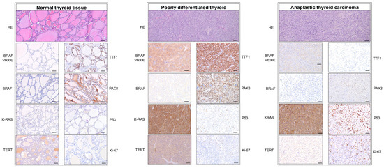 Example of histologic and immunohistochemical expression. (Left panel)—expression of markers on normal thyroid tissue: HE (top) shows normal follicular architecture. BRAFV600E is negative; BRAF is negative; TERT is negative in follicular cell nuclei; TTF1 positive; PAX8 positive; P53 wild-type pattern; Ki-67 negative. (Middle panel)—photomicrographs of a case of PDTC: HE (top) shows prominent trabecular proliferation with thin fibrovascular septa, cells present minimal pleomorphism and round heterochromatic nuclei without nucleoli. BRAFV600E diffused cytoplasmic staining (+3); B-RAF diffused cytoplasmic staining (+3); K-RAS diffused strong cytoplasmic staining (+3); PAX8 retained nuclear staining; TERT diffused nuclear staining in tumoral cells (3+); TTF1 diffused strong nuclear staining (3+); P53 wild-type pattern: nuclear staining in rare tumoral cells (+0); Ki-67 normal nuclear staining in very rare tumoral cells (+0). (Right panel)—photomicrographs of a case of ATC: HE (top) shows spindle cell proliferation (sarcomatoid) with marked nuclear atypia and bizarre hyperchromic nuclei and frequent mitoses; BRAFV600E zonal cytoplasmic staining (+2); B-RAF negative (+0); K-RAS diffused strong cytoplasmic staining (3+); PAX8 rare positive nuclei still retaining expression; TERT zonally positive perinuclear staining (+2); TTF1 negative (+0); P53 mutant-type pattern: positive strong nuclear stain in all tumoral cells (+3); Ki-67 high expression in >10% of tumoral cells (+2). Scale bar = 50 μm.