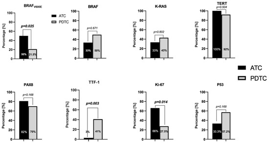 Graphs showing the percentage of abnormal expression of different markers by cancer subtype. ATC—anaplastic thyroid carcinoma; PDTC—poorly differentiated thyroid carcinoma.