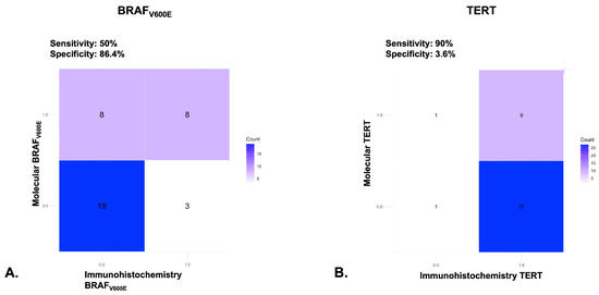We aim to assess the performance of the immunohistochemical analysis for BRAFV600E and of TERT, compared to their molecular counterparts. A confusion matrix analysis was performed to compare the immunohistochemical results of the specific anti-BRAFV600E antibody and anti-TERT against the standard molecular Sanger sequencing method.