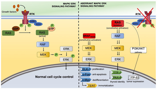 Normal (left) and aberrant (right) signaling pathways in thyroid carcinoma. The normal MAPK/ERK signaling pathway starts with growth factors that activate the RTK. Upon activation, its two intracellular domains cross-phosphorylate each other at the tyrosine residues. These phosphorylated residues activate GRB2, which recruits SOS1 adapter protein. SOS1 activates RAS, which begins the cascade by activating RAF, then MEK, which phosphorylates ERK. Phosphorylated ERK translocates inside the nucleus and controls the normal cell cycle. In the aberrant signaling pathway controlling thyroid carcinomas, the activation of the MAPK/ERK pathway works without the RTK and growth factors. BRAFV600E mutant protein is constitutively activated and further supra-activates MEK and ERK. RAS mutations are also constitutively activated and subsequently activate RAF, MEK, and ERK. This leads to the increase of different nuclear transcription factors such as ELK-1, c-Fos, c-Myc, and a decrease of TTF-1 and PAX-8, which results in thyroid identity loss and RAI refractoriness. c-Myc can activate the transcription of TERT, or a TERT promoter mutation leads to cell immortalization. Mutant RAS can also decrease TP-53 via PI3K-AKT pathway, resulting in loss of tumor suppression and chaotic cell cycle.