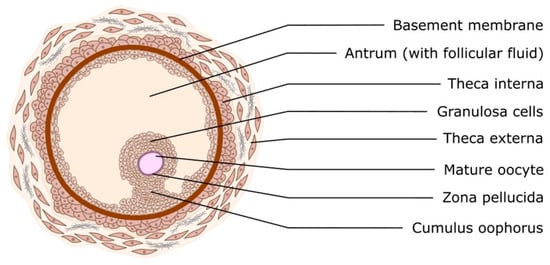 The physiological events that occur during the normal estrous cycle are regulated by hormones from the hypothalamus (gonadotropin-releasing hormone; GnRH), the anterior pituitary (follicle-stimulating hormone; FSH and luteinizing hormone; LH), the ovaries (progesterone; P4, estradiol; E2 and inhibins), and the uterus (prostaglandin F2) [1]. These glands function through a system of positive and negative feedback that regulate the entire estrous cycle. The estrous cycle is characterized by great variability among species and even individual variability, as in women, where we observe different cycle lengths (26–35 days) [2]. In all women, there is an increase in FSH during the luteal–follicular transition, which stimulates follicular growth and inhibits B secretion in the early follicular phase. The selection of the dominant follicle of ovulation (DF) occurs during the mid-follicular phase, and the gonadotropin response, insulin-like growth factor (IGF) binding protein expression and degradation, and vascularization have been identified as critical factors in DF selection and progression. Two-thirds of women exhibit two follicular waves, while one-third exhibit three follicular waves per cycle. Women with three waves have longer cycles and a later estradiol and luteinizing hormone (LH) surge. The corpus luteum secretes progesterone, estradiol, and inhibin A in response to LH pulses and peaks 6–7 days after ovulation [3]. As shown in Figure 2, the ovarian follicle consists of an oocyte surrounded by granulosa and theca cells. This represents the basic functional unit of the ovary. The process of follicular growth can be categorized into three distinct phases, distinguished by their developmental stage and gonadotropin dependence: Firstly, primordial, primary, and secondary stages (gonadotropin-independent phase) are characterized by follicular growth. Secondly, there is a transition from preantral to early antral stage (gonadotropin-responsive phase). Thirdly, there is continual growth beyond the early antral stage (gonadotropin-dependent phase), which includes follicle recruitment, selection, and ovulation [4,5,6]. In the gonadotropin-responsive phase, follicle growth is primarily governed by intraovarian regulators (e.g., 61 growth factors, cytokines, and gonadal steroids), thus obviating the need for gonadotropins. Nonetheless, the presence of FSH has been demonstrated to stimulate this process [7,8]. The cells immediately surrounding the oocyte are known as cumulus cells, and these cells accompany the oocyte throughout its development from immature to fully mature ovulatory oocyte. They play a pivotal role in maintaining the oocyte, both in vivo and in vitro [9]. The zona pellucida (ZP) is a glycoprotein interface between oocytes and surrounding cells that covers and protects the mammalian oocyte. The zona pellucida plays an important role in sperm-oocyte interaction, the acrosome reaction, and the blockade of polyspermy [9]. It should be noted that the expression of angiogenic mediators in the ovary is not constitutive but dynamically regulated. Hypoxia accompanying follicle growth and luteinization, gonadotropin stimulation, and inflammatory signals associated with ovulation represent key triggers for the synthesis of VEGF, FGF, PDGF and related factors. By precisely regulating the pathways involved in angiogenesis, it is possible to ensure a dynamic balance between vessel formation and regression, which is essential for the proper functioning of the ovary. Deregulation of these processes has been linked to pathologies such as polycystic ovary syndrome (PCOS) and ovarian cancer. It is important to consider the role of angiogenic factors relative to their function in physiological and pathological conditions.