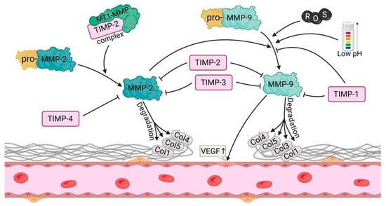 MMPs way of action, activation and regulation though TIMP in angiogenesis (abb: mmp-2/9, matrix metalloproteinase-2/9; MT1-MMP, membrane type 1 matrix metalloproteinase; TIMP1/2/3/4, tissue inhibitor of metalloprotease-1/2/3/4; ROS, reactive oxygen species; Col1/3/4/5, collagen type 1/3/4/5; VEGF, vascular endothelial growth factor).