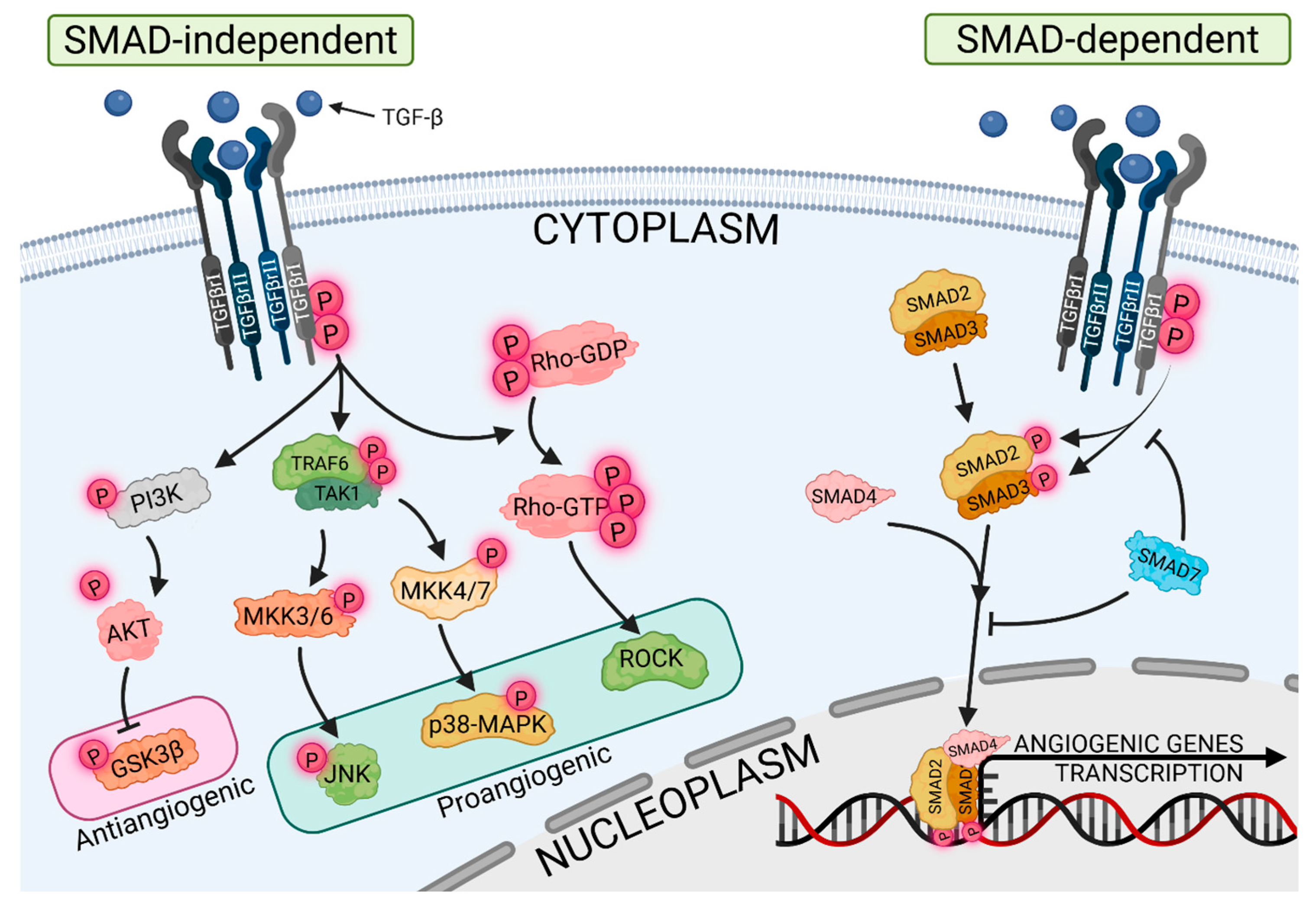 - Zhang, Y.E. Non-Smad Signaling Pathways of the TGF-β Family. Cold Spring Harb. Perspect. Biol. 2017, 9, a022129. [Google Scholar] [CrossRef] [PubMed]