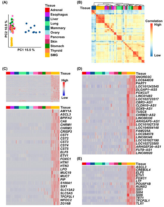 Generation of a tissue-specific human SMG gene signature. (A) Principal component analysis (PCA) coordinates from 11 human organs and tissues. (B) Correlation plot demonstrating that the human SMGs cluster closely with the esophageal, mammary, and skin. (C) Heatmap of the gene expression values selected from the tissue-specific SMG signature across 11 adult human tissues (upper panel). The lower panel demonstrates a hierarchical cluster analysis of genes identified in the SMG signature, which have been shown to play a role in salivary gland biology. (D) Heatmap of the enriched top 25 lncRNA-coding genes identified in the gene signature. (E) Heatmap of the enriched transcription factors identified in the gene signature.