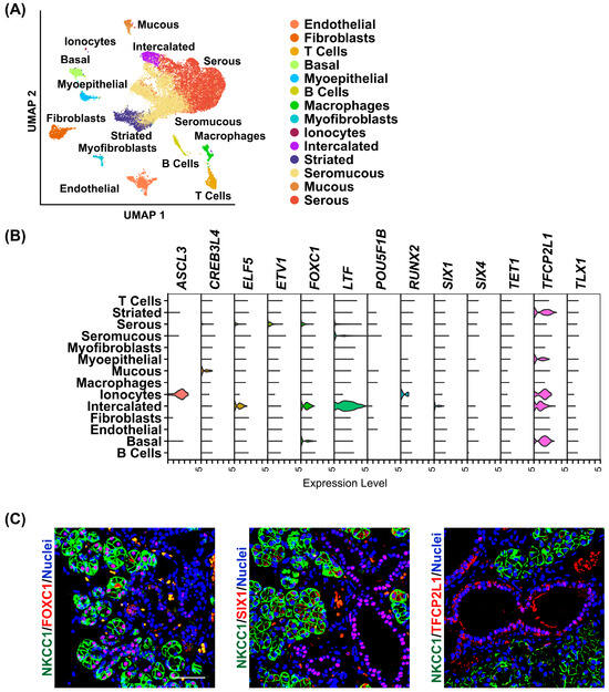 Given the enriched mRNA expression of these TFs, we next sought to examine their localization pattern within the heterogeneous milieu of cell types that are inherent to the human SMG. For this purpose, we leveraged our previously published human SMG scRNA-seq reference dataset, which identified 14 distinct cell populations composed primarily of epithelial cell types and supporting stromal cells such as immune and endothelial cells [19] (Figure 2A). We found that several TFs comprising the SMG gene signature exhibited epithelial-enriched expression, with cell-type specificity ranging from broad epithelial distribution to highly restricted expression in distinct epithelial cell subtypes. For example, we found ASCL3 and RUNX2 to be specifically enriched in ionocytes, while CREB3L4 and ETV1 were almost exclusively expressed in the mucous and serous cells, respectively (Figure 2B). In contrast, SIX1, FOXC1, and ELF5 were predominantly expressed in the intercalated ducts (IDs) [11,12,19,27,30]. These distinct expression patterns are consistent with our previous findings in the SMG and strongly support the possibility that specific TFs work together to coordinate and maintain cell-type specific gene expression patterns in the human SMG [12,27] (Figure 2B). To validate that the transcriptomic profiles correspond to protein expression, we performed immunofluorescence analysis and co-stained human SMG tissue with antibodies against FOXC1, SIX1, and TFCP2L1 (shown in red), alongside the acinar cell-specific marker NKCC1, shown in green, confirming the cell-type-specific localization of these TFs at the protein level (Figure 2C).